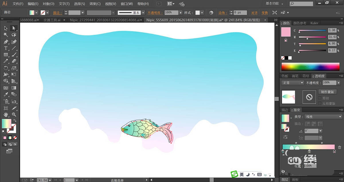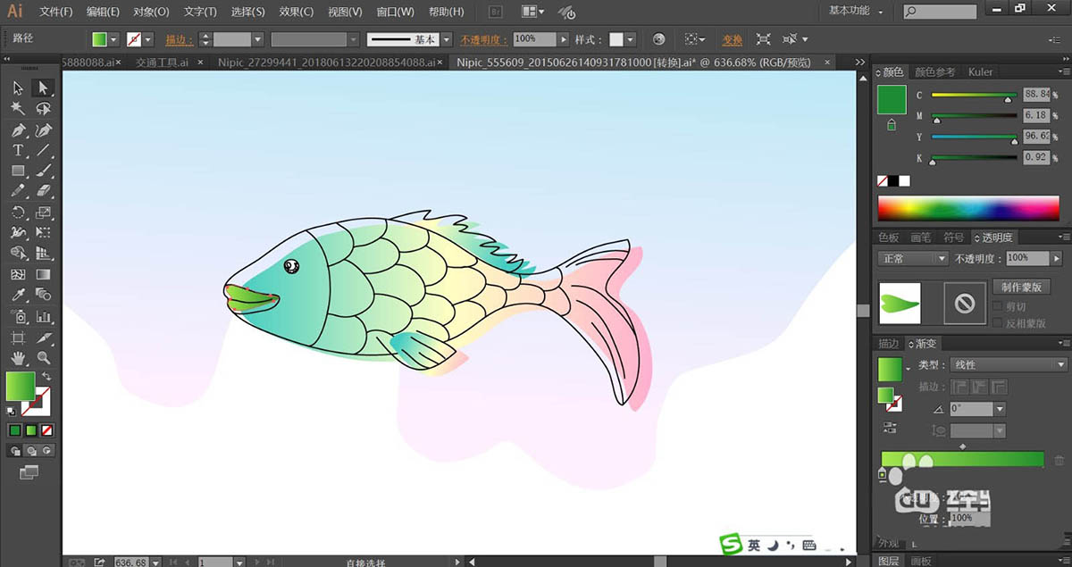 3、鱼嘴巴的路径使用绿色的渐变填充,左上角的小鱼使用浅粉红色的渐变填充。