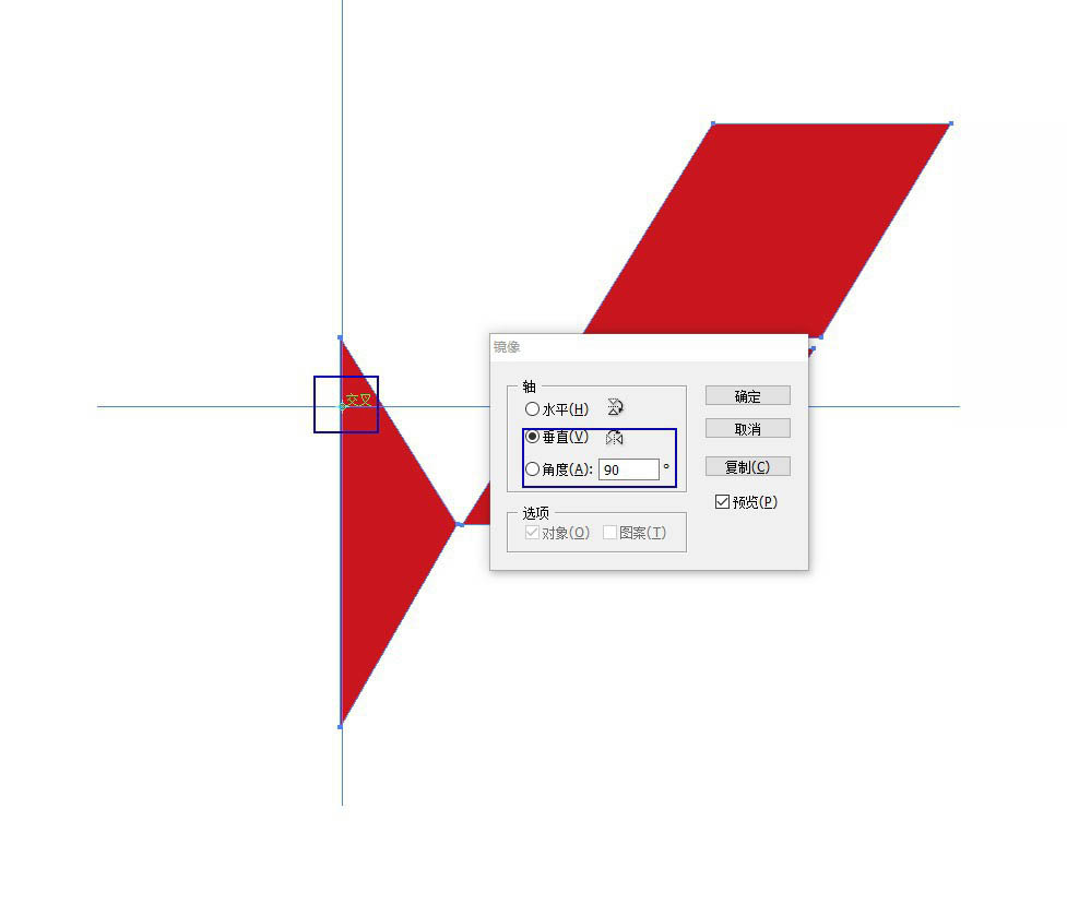 4、将左边部分编组后,选择镜像工具,按住alt键,在如图所示位置点击,在弹出的对话框里,设置如图参数。