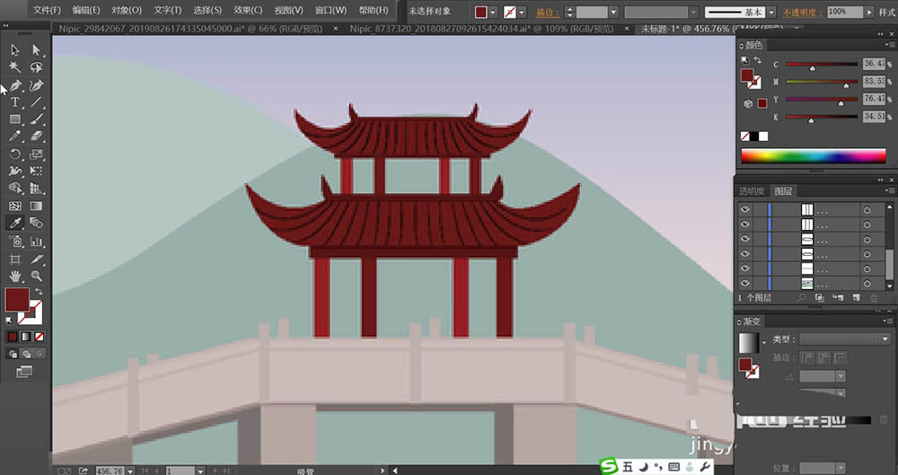 1、使用钢笔工具画出桥上的凉亭的基本形状,再用红棕色填充凉亭,使用红褐色填充立柱,使用黑色填充凉亭内的轮廓线条。
