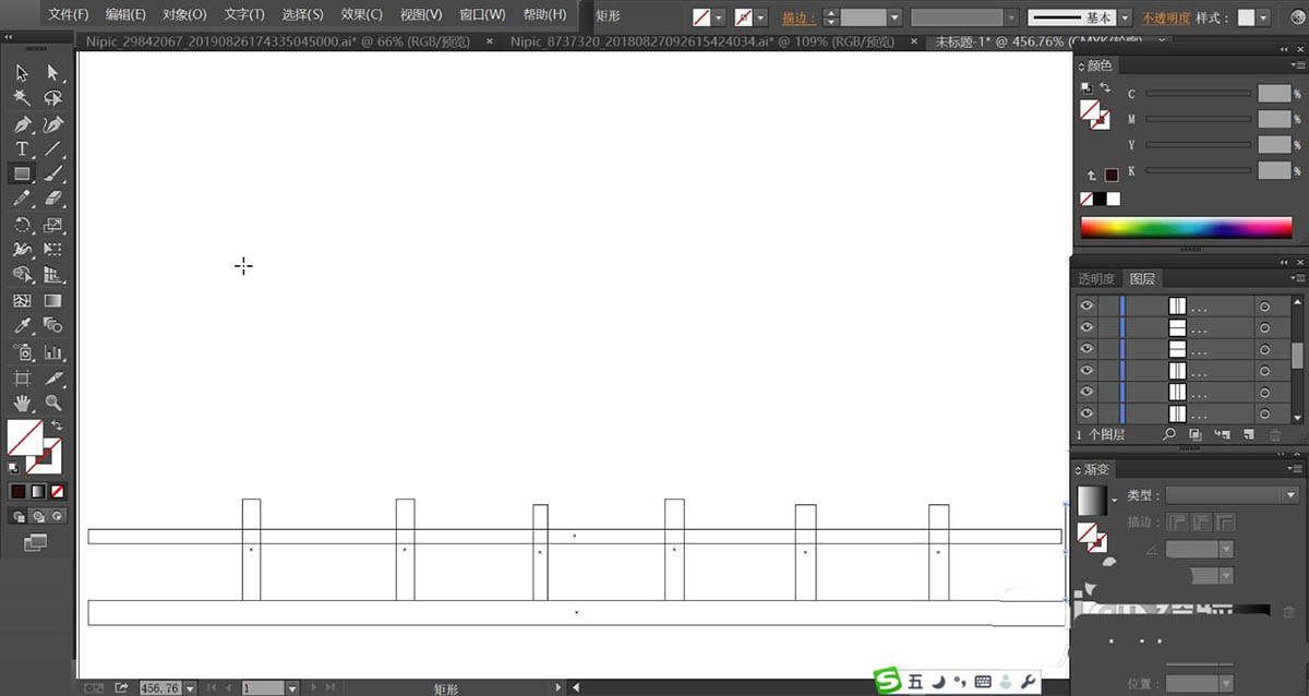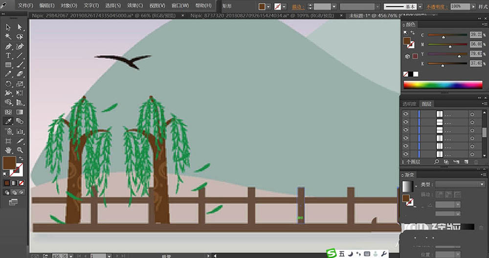 2、接着,我们用矩形画出画出河边的栏杆,使用灰褐色填充栏杆的路径,再用钢笔画出河边的小树,使用黄绿色填充树干,再用绿色填充树叶的路径,枝条使用暗绿色填充。