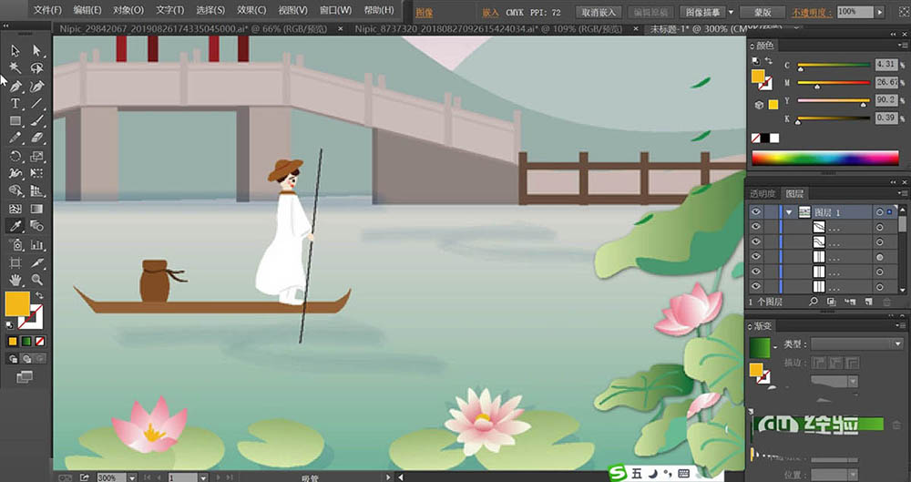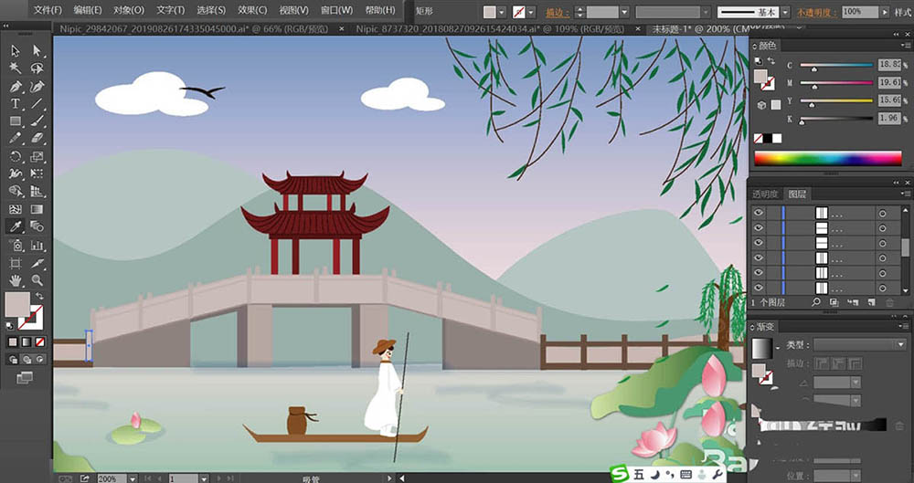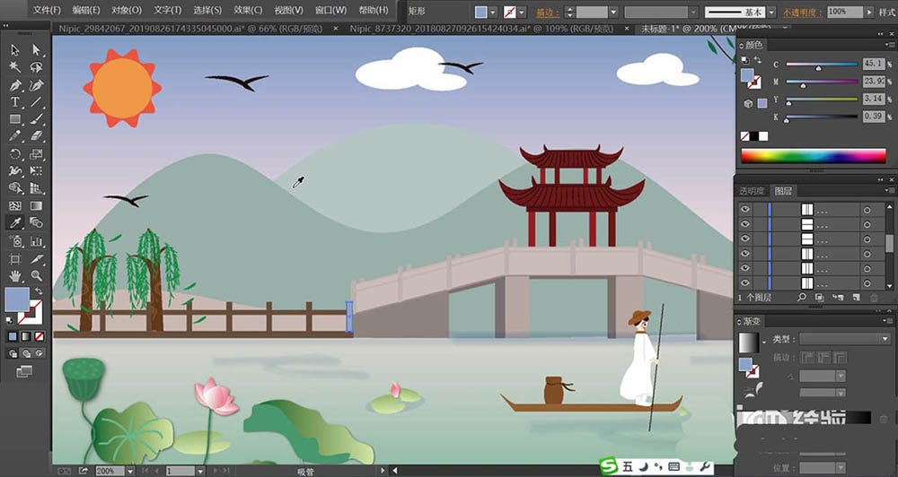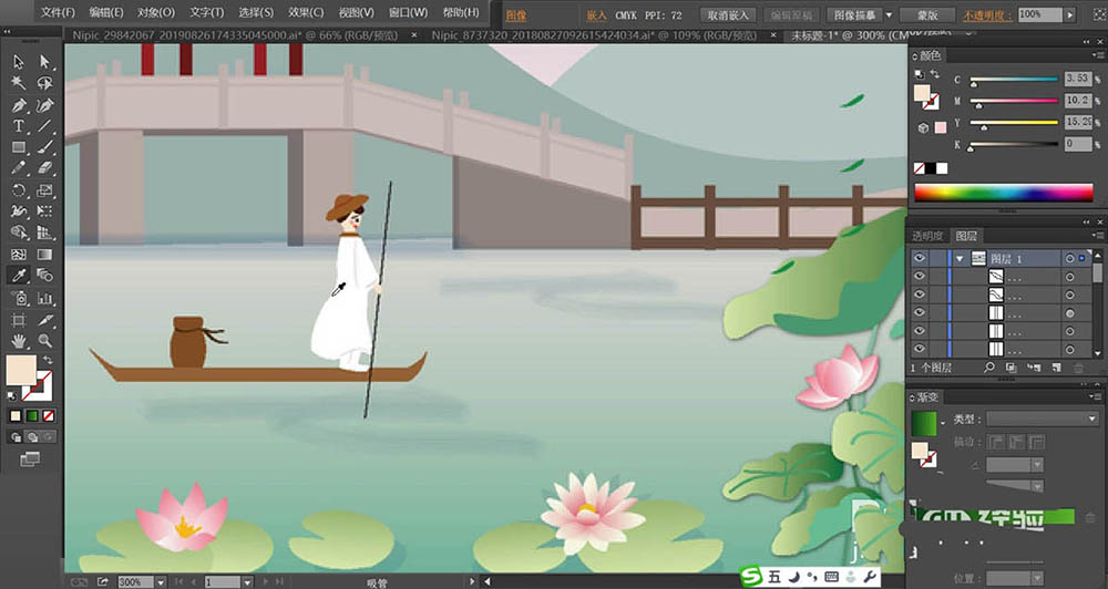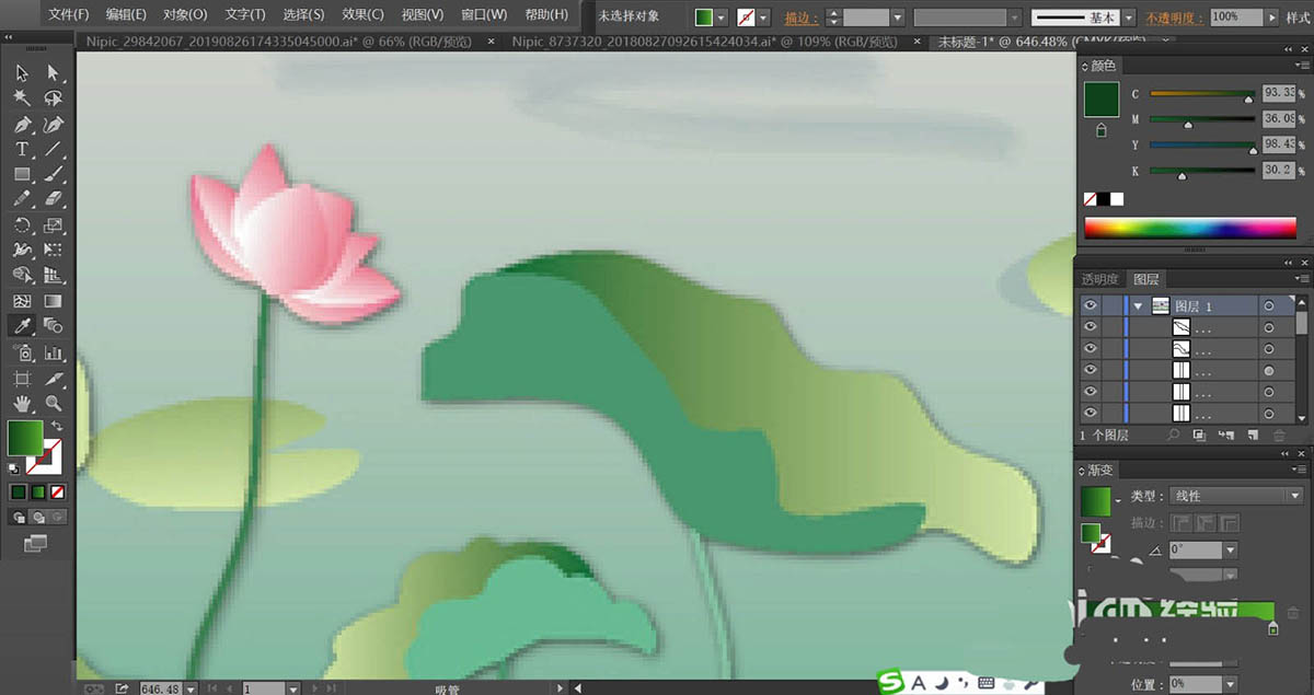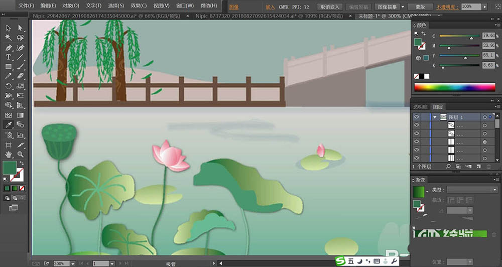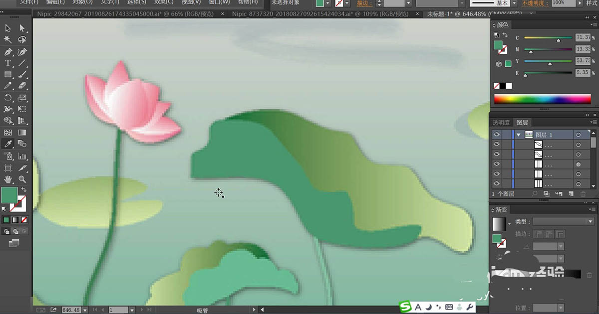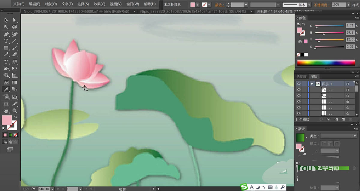 6、荷花使用桃色的渐变填充,再用绿色填充荷花的枝条,不同的荷叶与荷花稍稍调整一下色调,让它们有着明暗效果的变化。河水使用青色的渐变填充,近处较深一些,远处较淡一些。