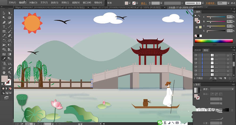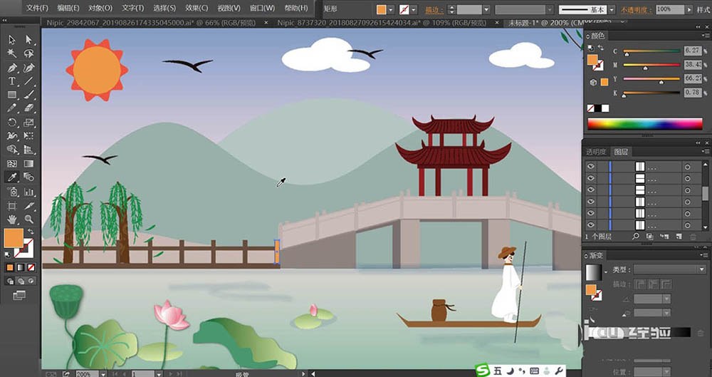 4、太阳使用橙红色填充内部,使用桔红色填充外部,小桥使用灰白色、灰色、暗灰色填充不同的结构路径。在图处的右侧画出很多的柳树枝条,我们用暗绿色与绿色分别填充枝条与柳叶。