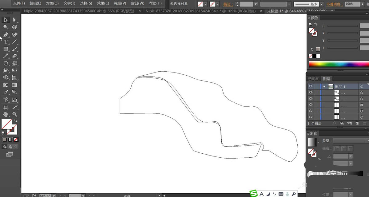 3、继续绘制远处的山峰与天空、云朵、太阳的路径,我们使用浅绿灰色填充山峰并设置不同的透明度让山峰有远近的层次,再用天蓝色的渐变填充天空,云朵使用白色填充。