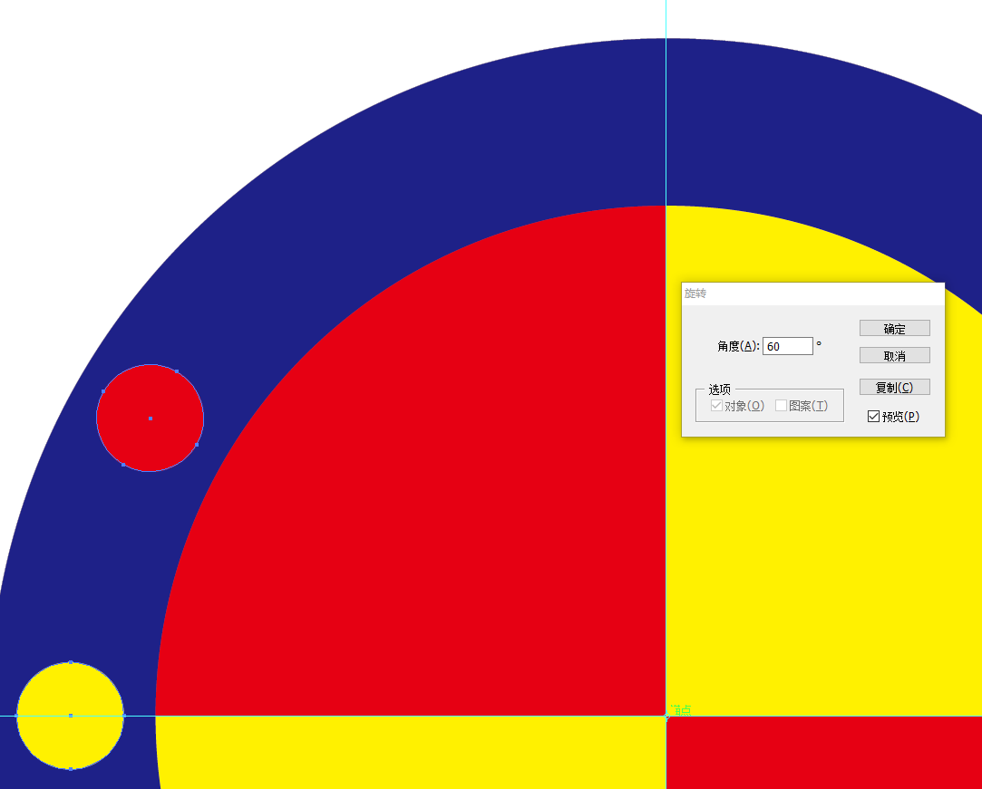 11、将两个小正圆进行编组,同样,设置好旋转点,对小的正圆进行旋转复制,如图。
