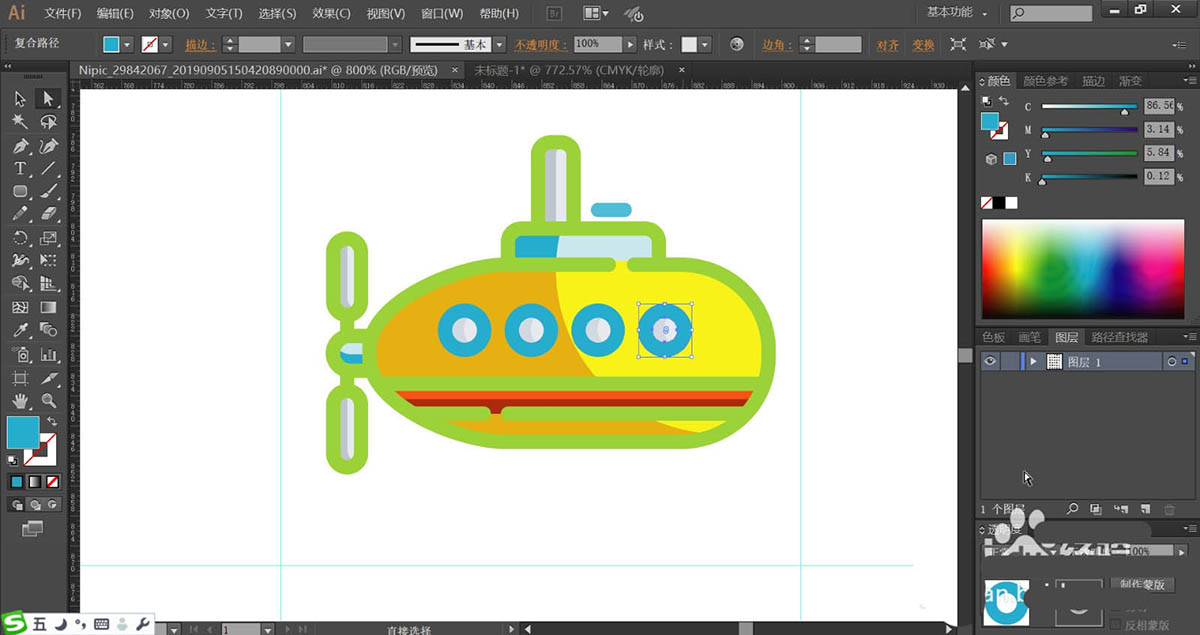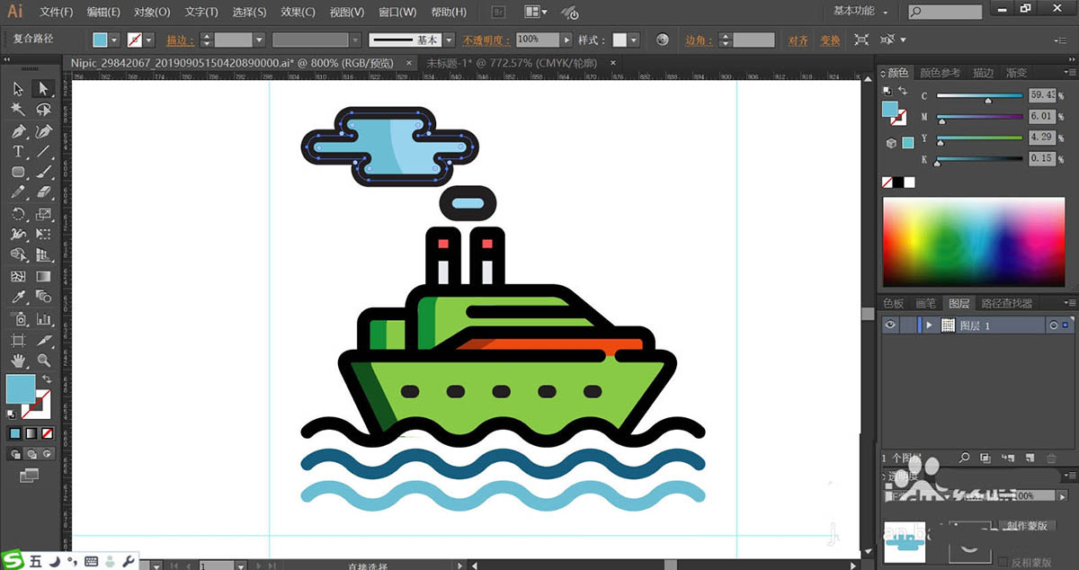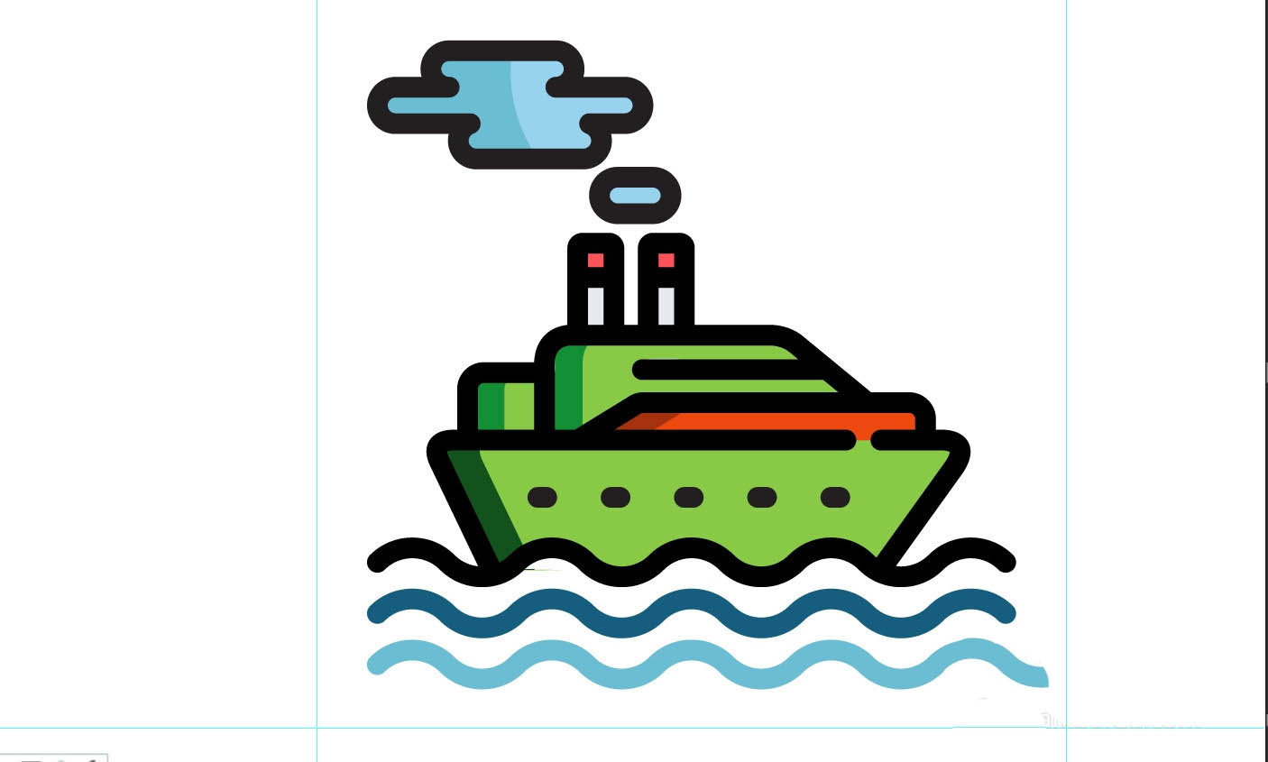 2、使用明暗天蓝色与黑色搭配填充云朵的路径,再用明暗两种绿色填充轮船的左侧与右侧的船体路径,左侧为暗光用深色,右侧为亮光用浅色。
