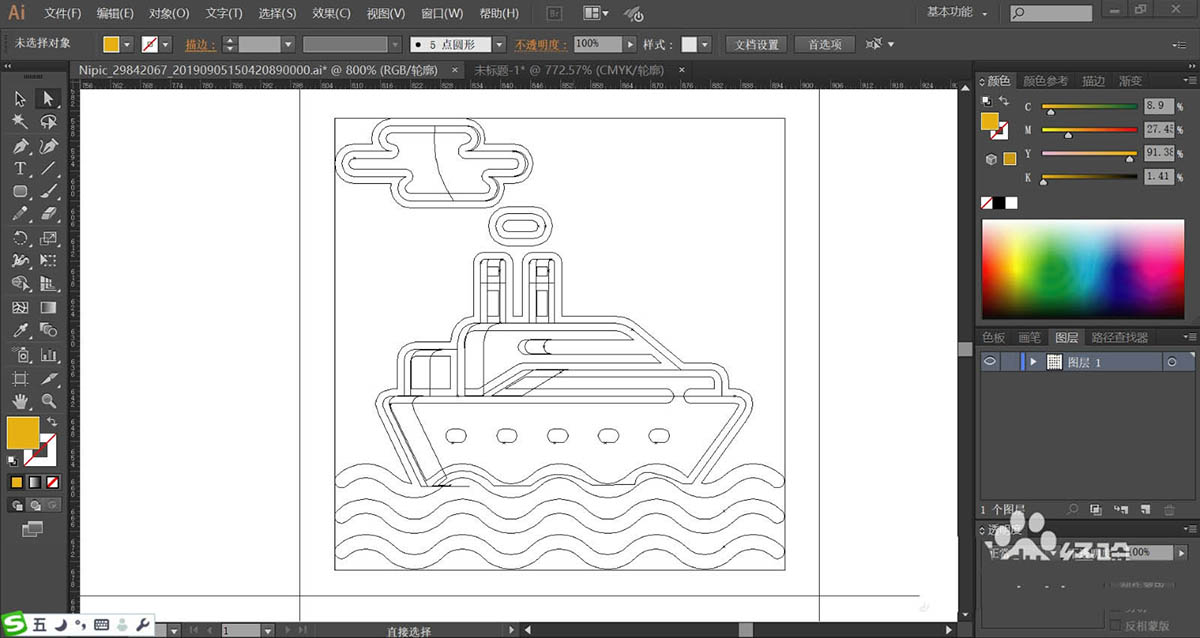 1、使用钢笔画出轮船上方的云朵路径,再画出轮船的基本轮廓,使用矩形工具画出船体上面的船舱结构,再用钢笔工具画出轮船下方的波浪曲线的路径。