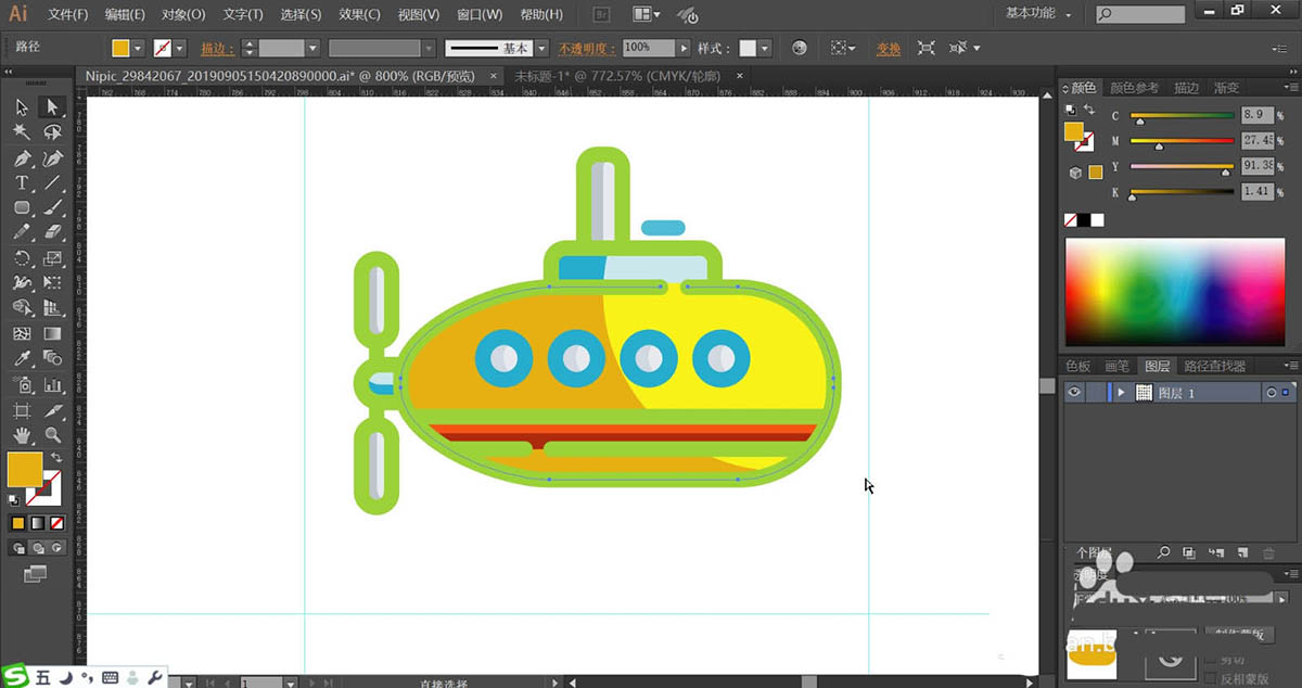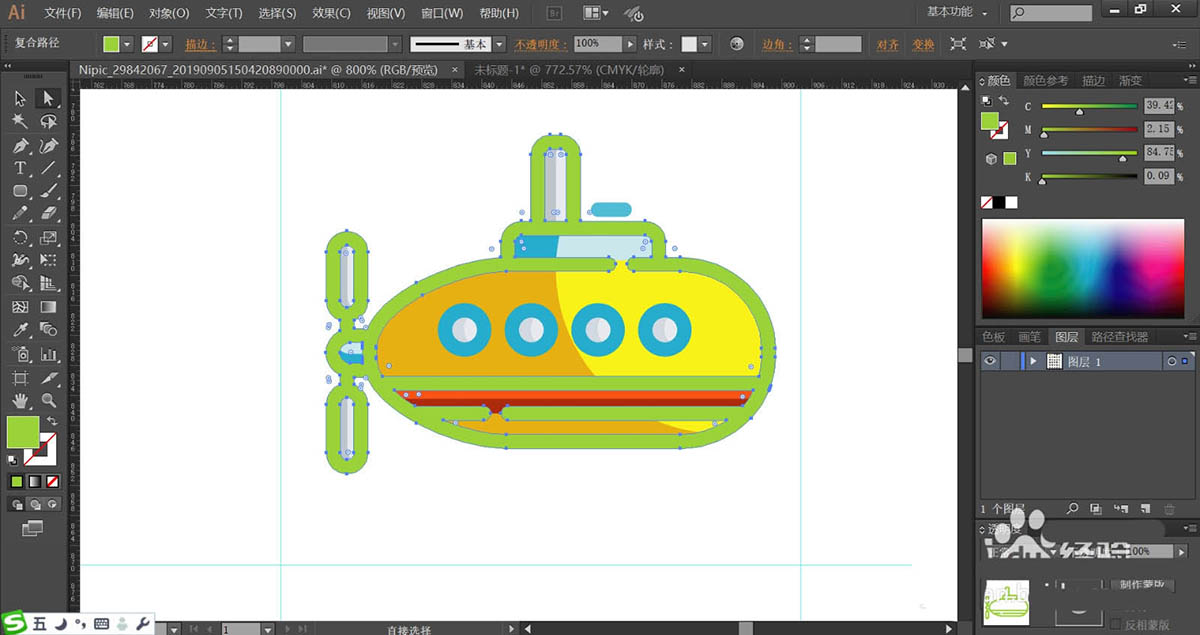 7、使用绿色填充飞船的轮廓,再用黄色与黄褐色搭配填充船体路径。中间的窗户路径用蓝色与灰白色搭配填充。