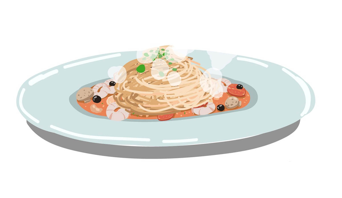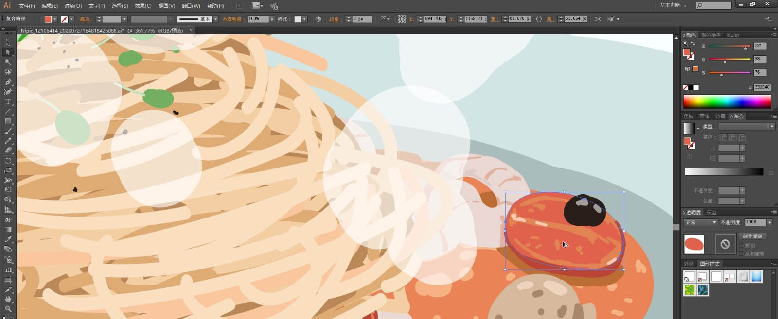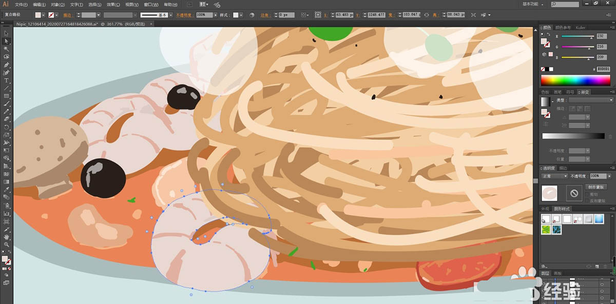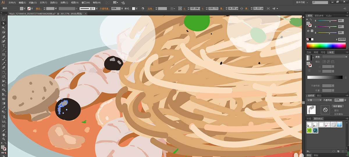 1、使用圆形绘制出餐盘的内外轮廓路径,再绘制出它的阴影与内部的汤汁的细节路径,使用钢笔绘制出面条的外部、中间与内部的不同面条的细节路径,再画出面条外面与里面的虾仁、葱叶、蘑菇等其它食材的路径。