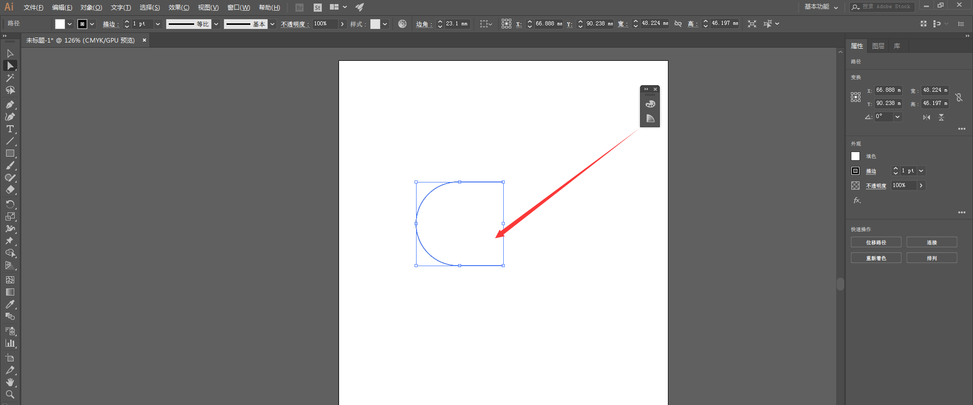 2、接着选择直接选择工具,将一边设置为圆角,如下图所示;