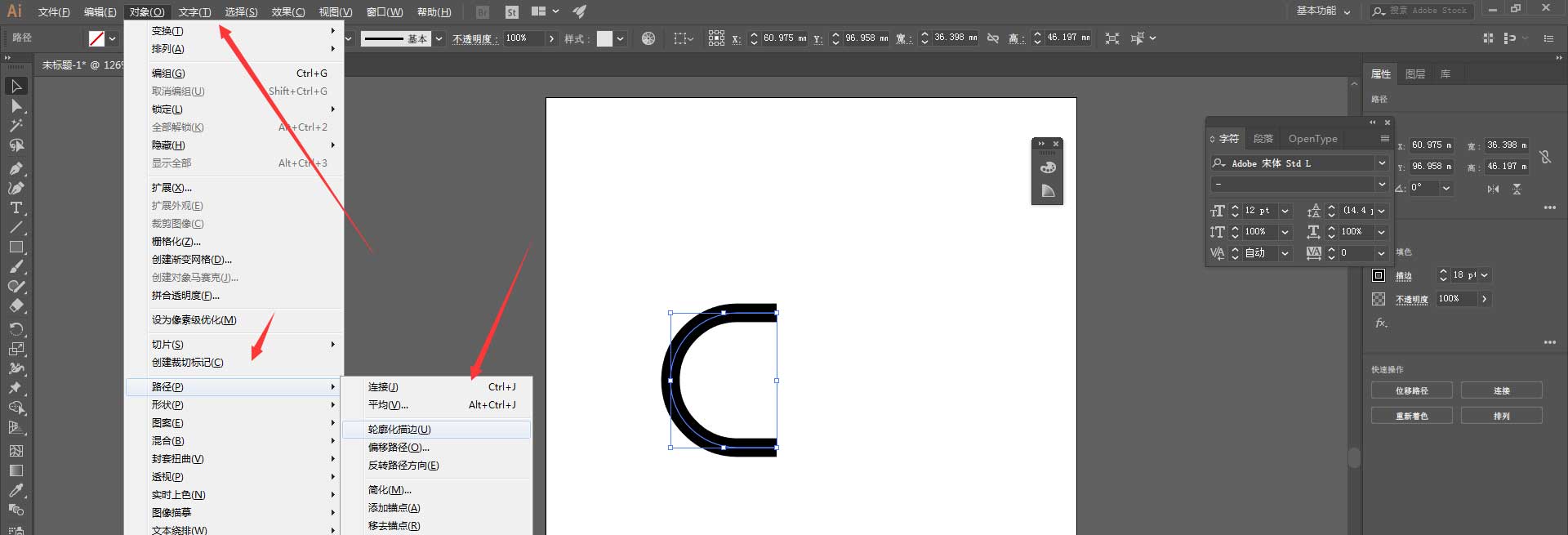 4、接着选中对象,点击对象--路径--轮廓化描边;