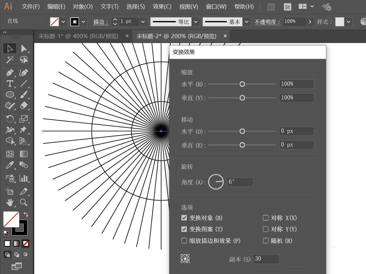 5、设置旋转角度为6度,副本为30,点击确定,得到如下图案;