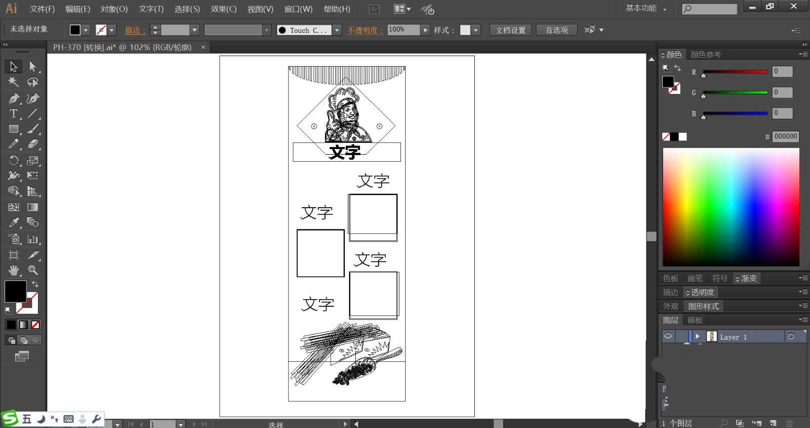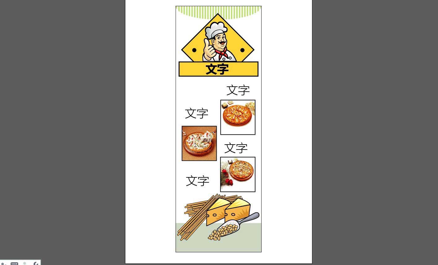 1、使用矩形绘制出披萨海报的基本版面,再用钢笔绘制出海报上方的图形与厨师形象 ,再导入海报中间的美食照片,绘制出海报下方的面包的形象。