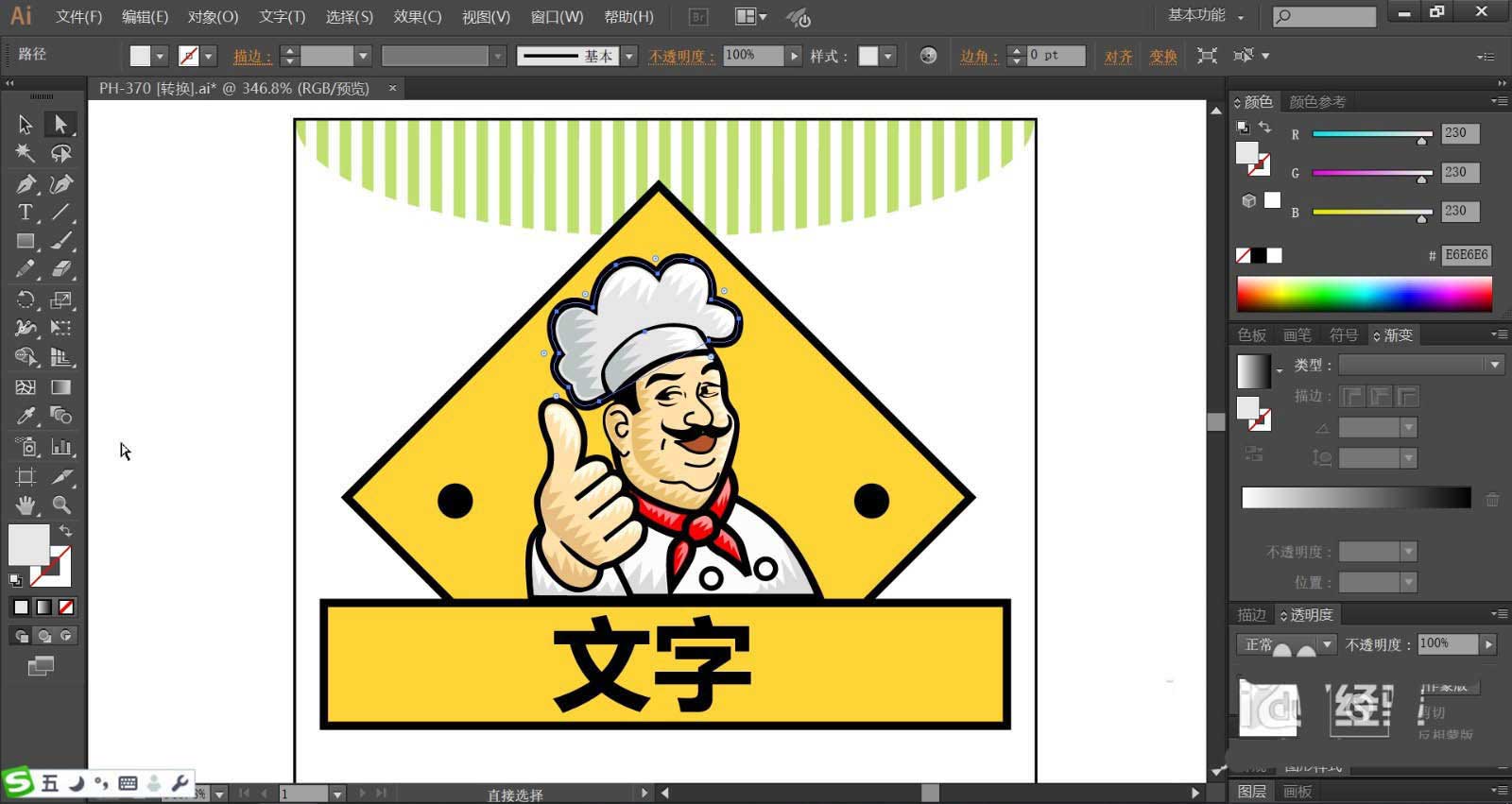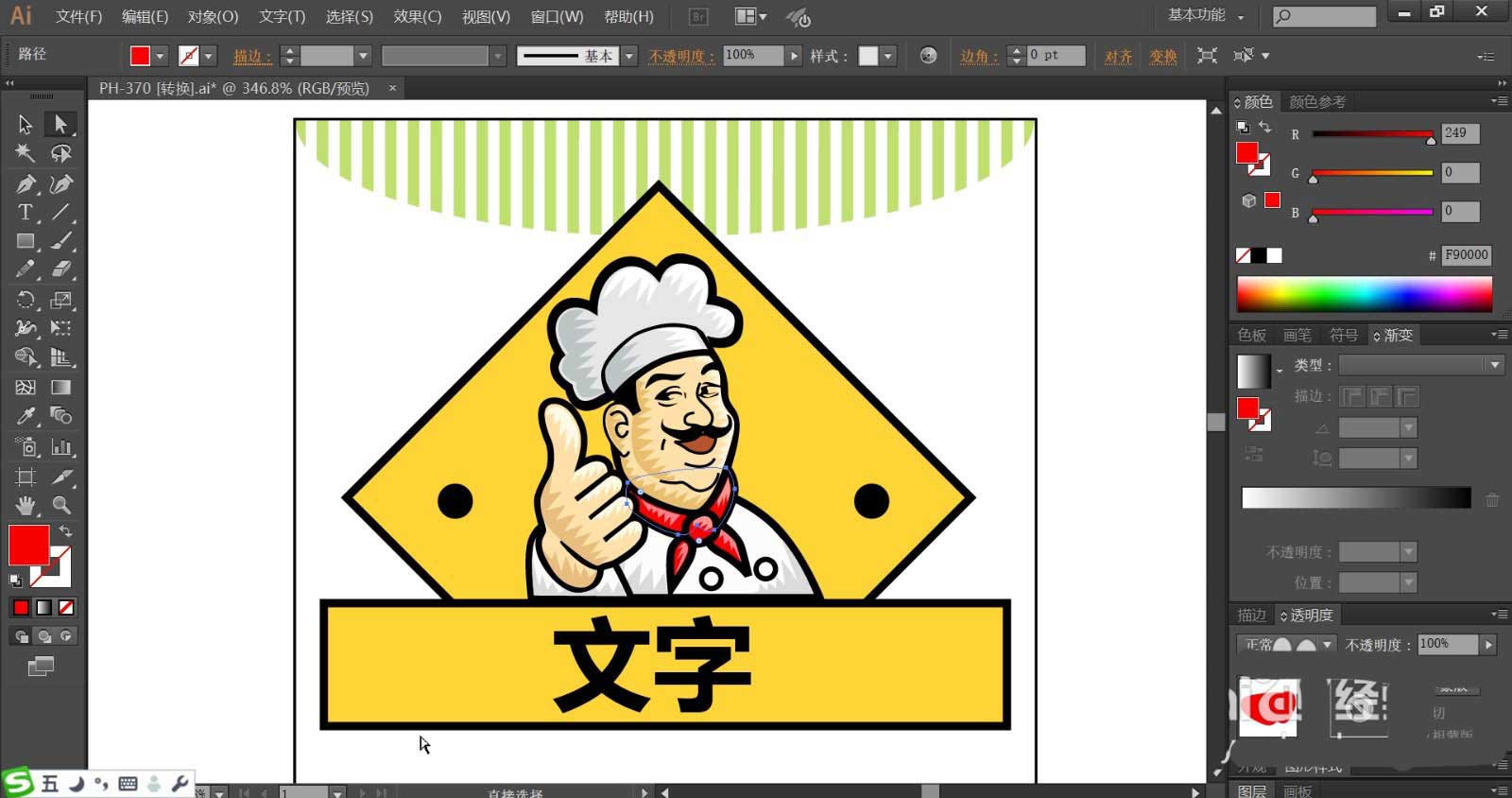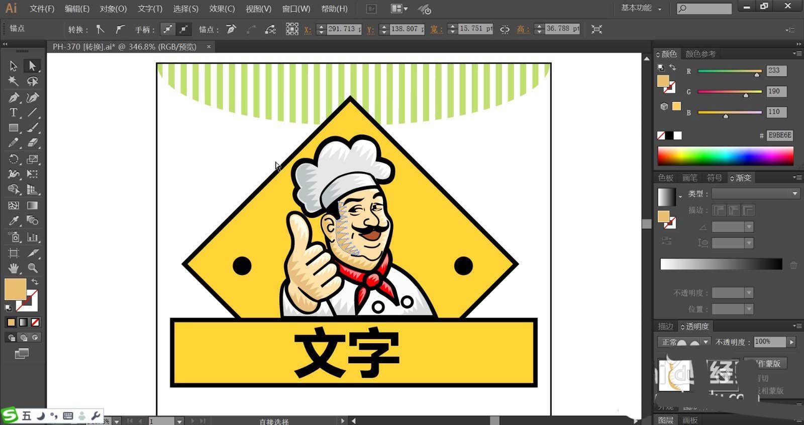 5、厨师的衣服与手臂分别用灰白色与黄粉色搭配填充,矩形上方的文字使用黑色填充。文字在矩形底板的中间位置。