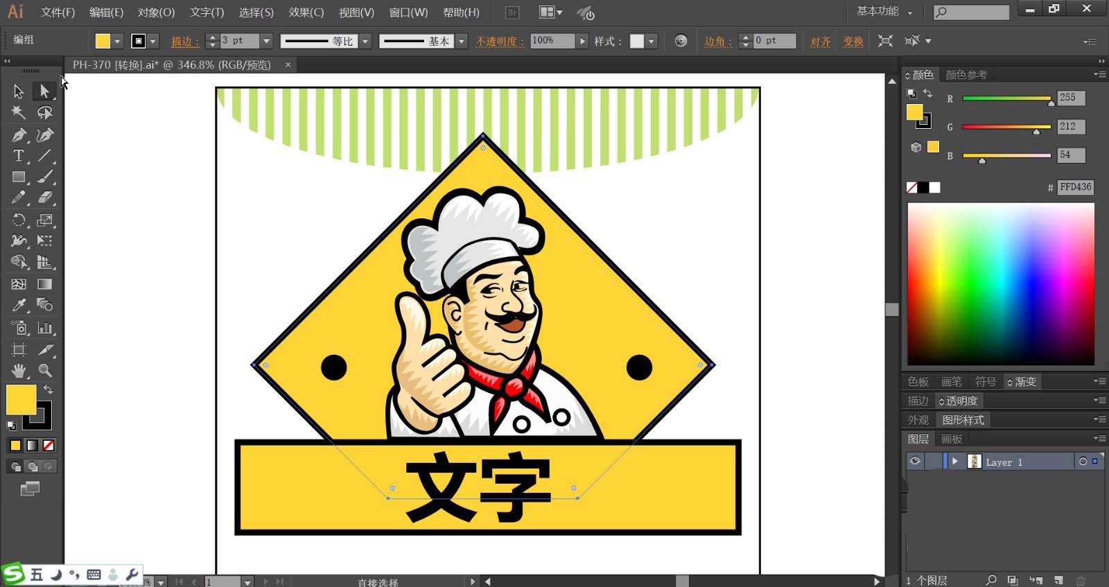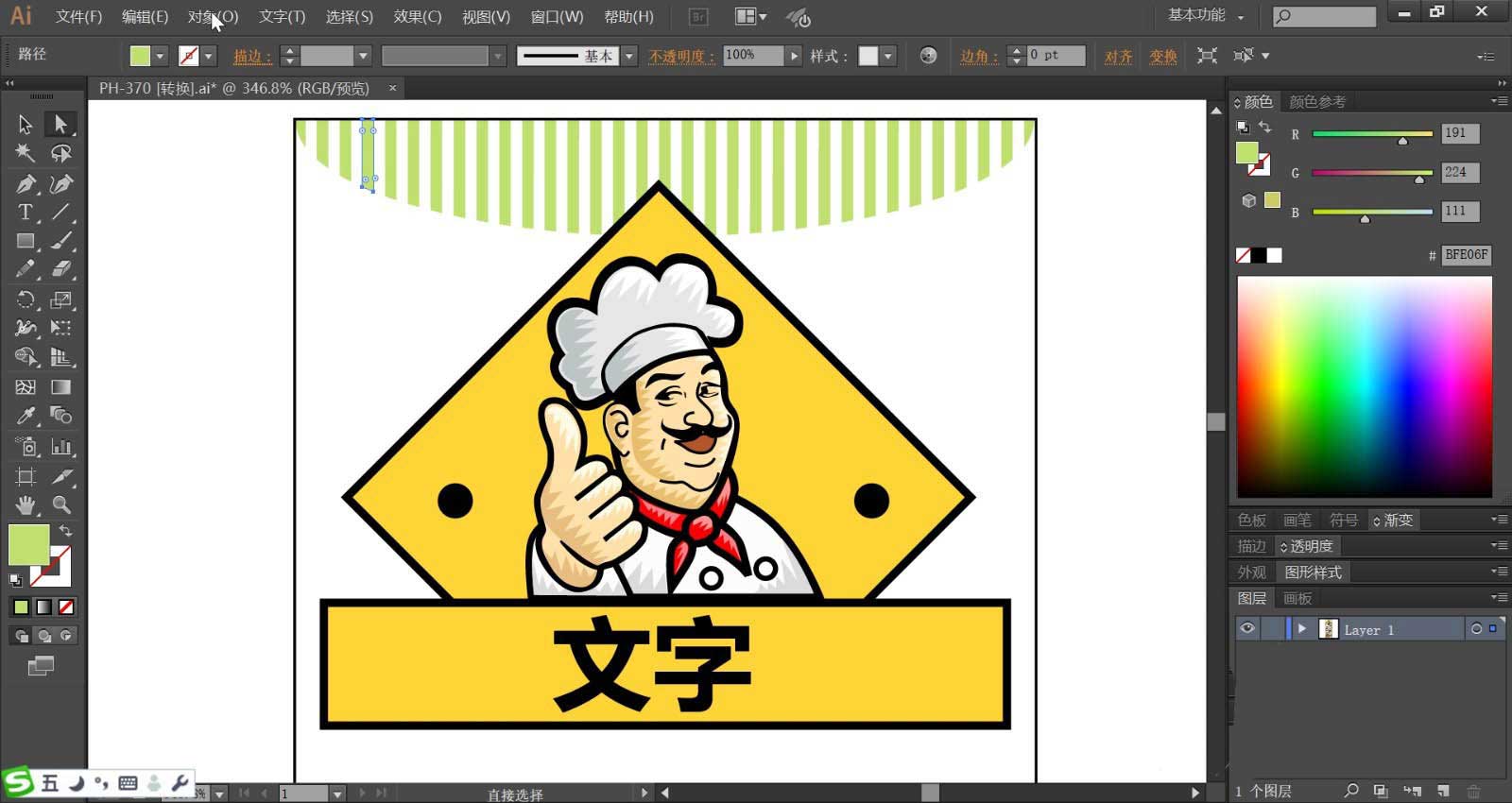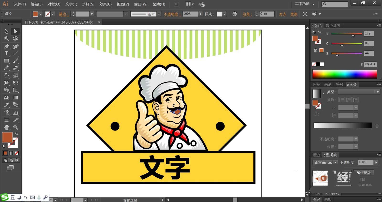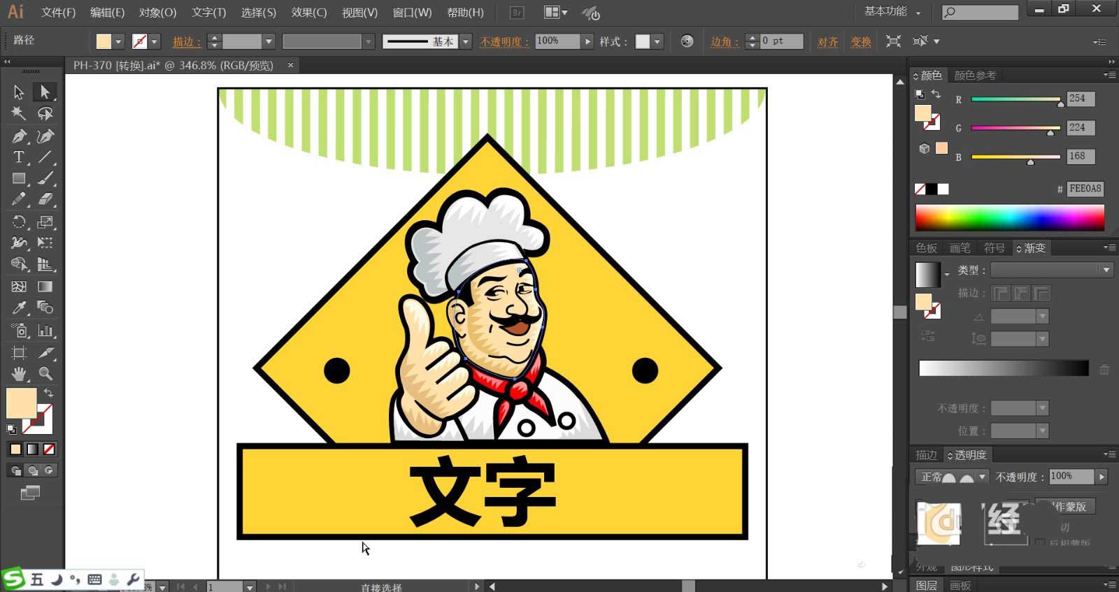 5、厨师的衣服与手臂分别用灰白色与黄粉色搭配填充,矩形上方的文字使用黑色填充。文字在矩形底板的中间位置。