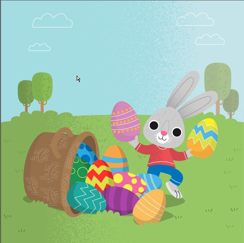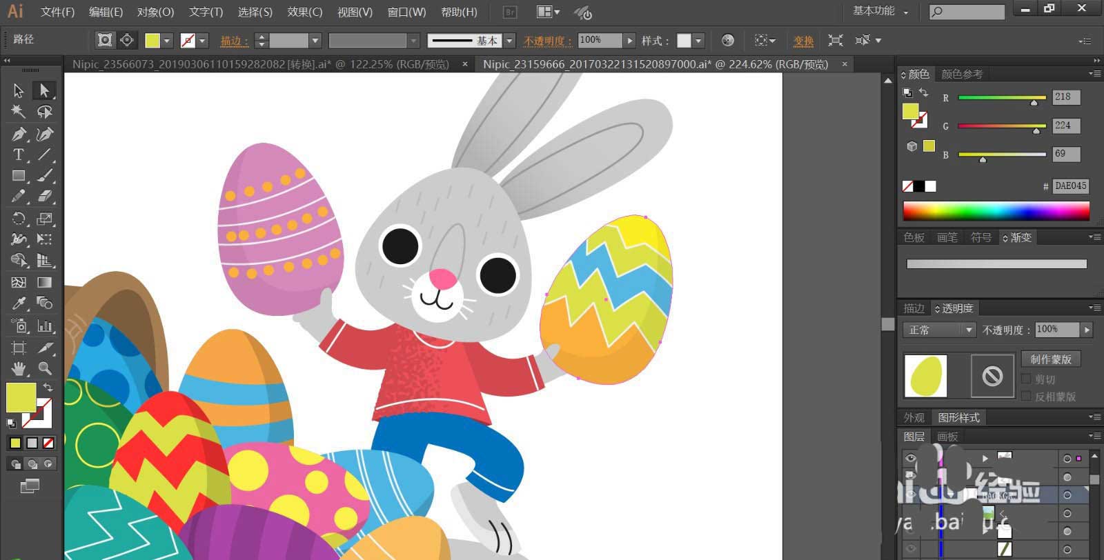 7、最后,其它的彩蛋使用红绿色、红黄色、橙蓝色等套色进行搭配填充,再做出表面的暗光效果,绘制出地面的黑色的阴影,完成调皮兔插画设计。