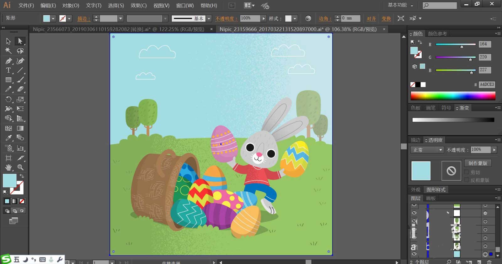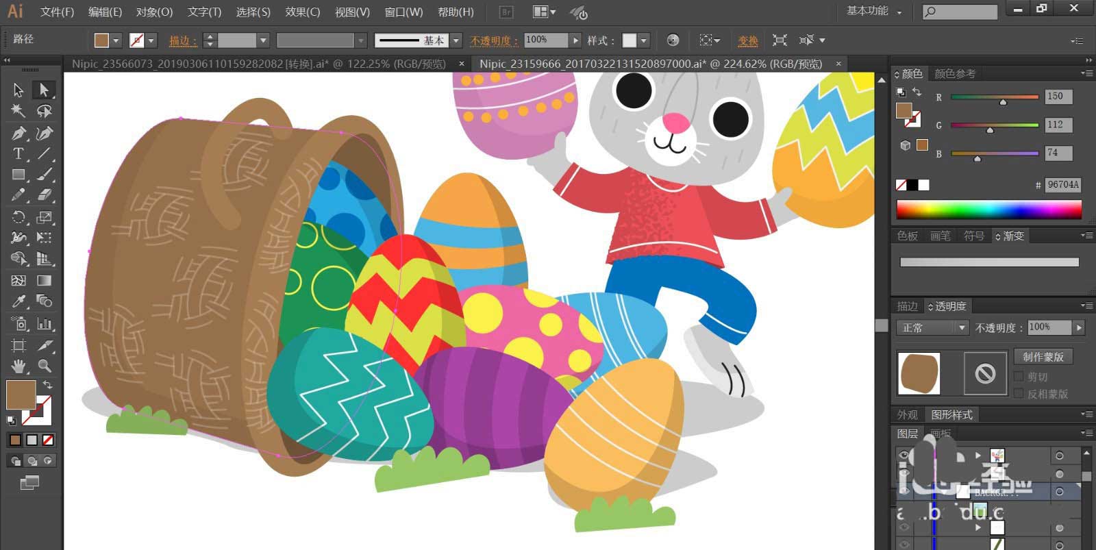 3、接着,我们用钢笔工具画出兔子的服饰与它下方的各种椭圆形状的彩蛋的路径与图案,还有左侧的大圆桶的路径。