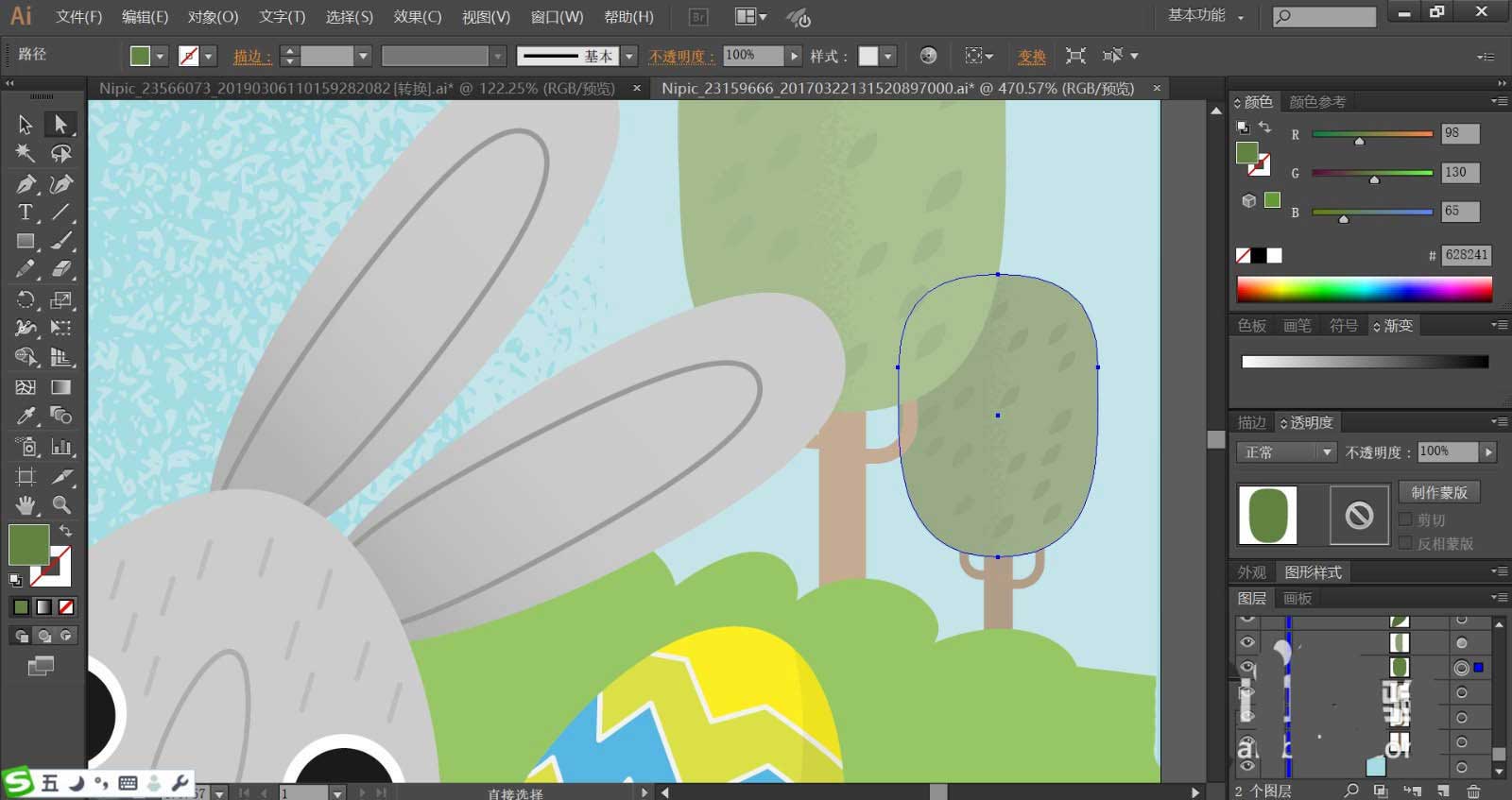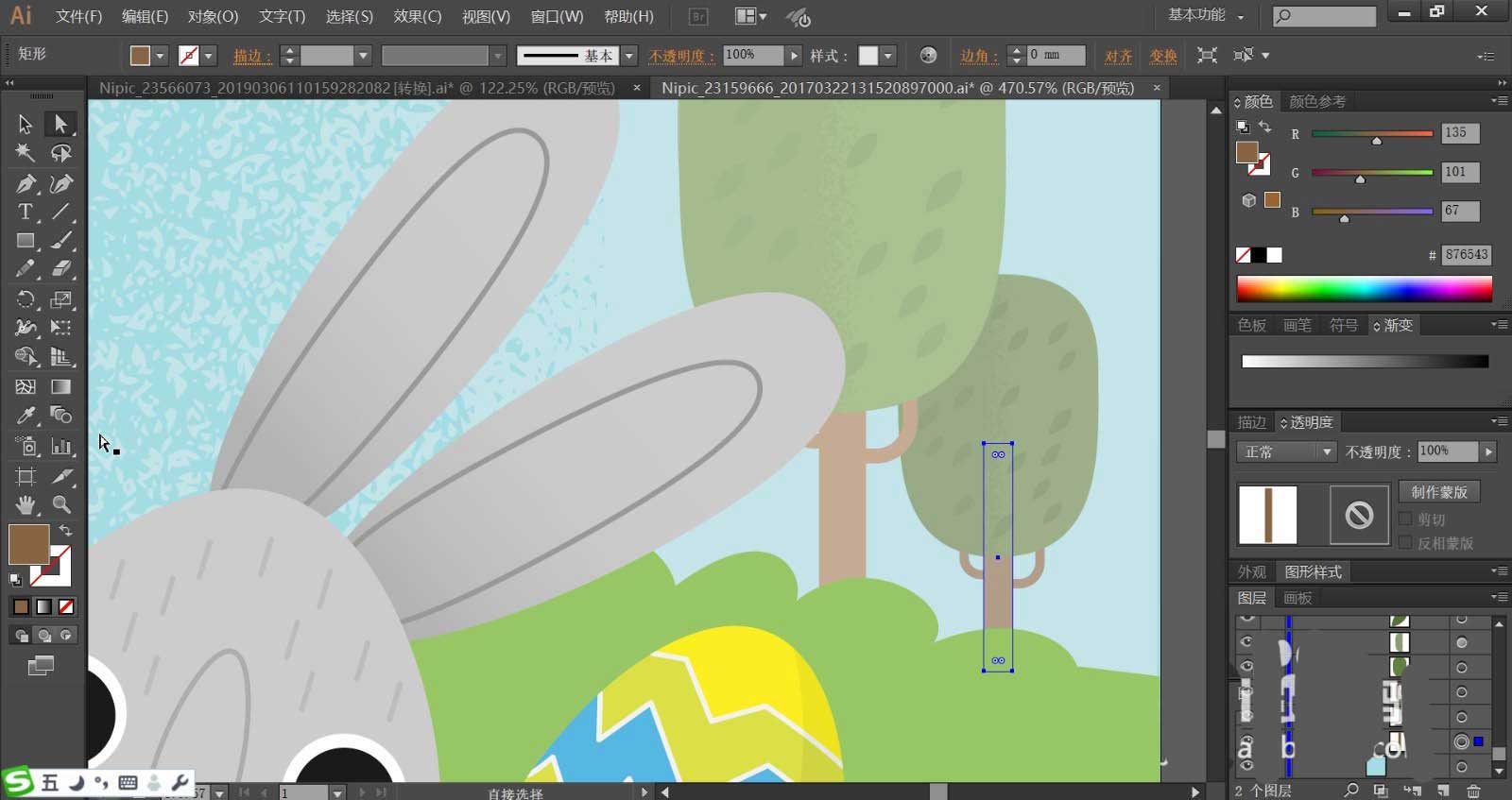 2、草地上面的小树使用不同明度的绿灰色填充,再用茶色填充树干。兔子的耳朵使用灰色的渐变填充。