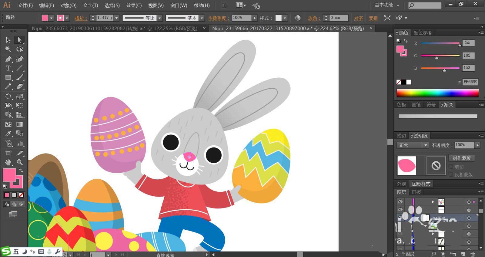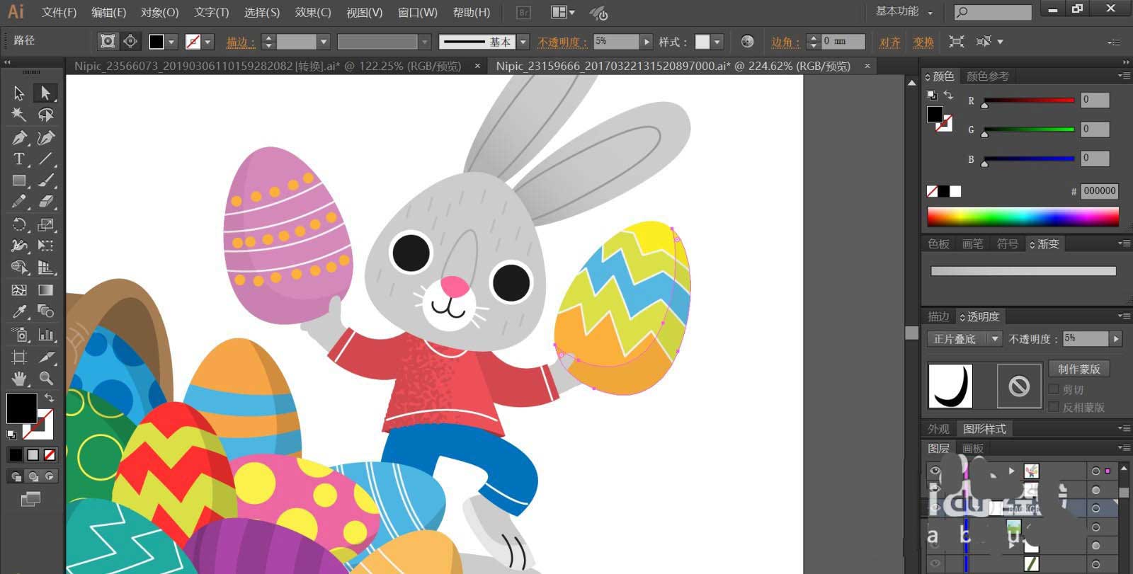 5、使用粉红色填充兔子手里的彩蛋,再用透明度为50%的正片叠底的黑色填充暗光路径。使用黄色与绿色、橙色、蓝色搭配填充兔子手里右侧的彩蛋。