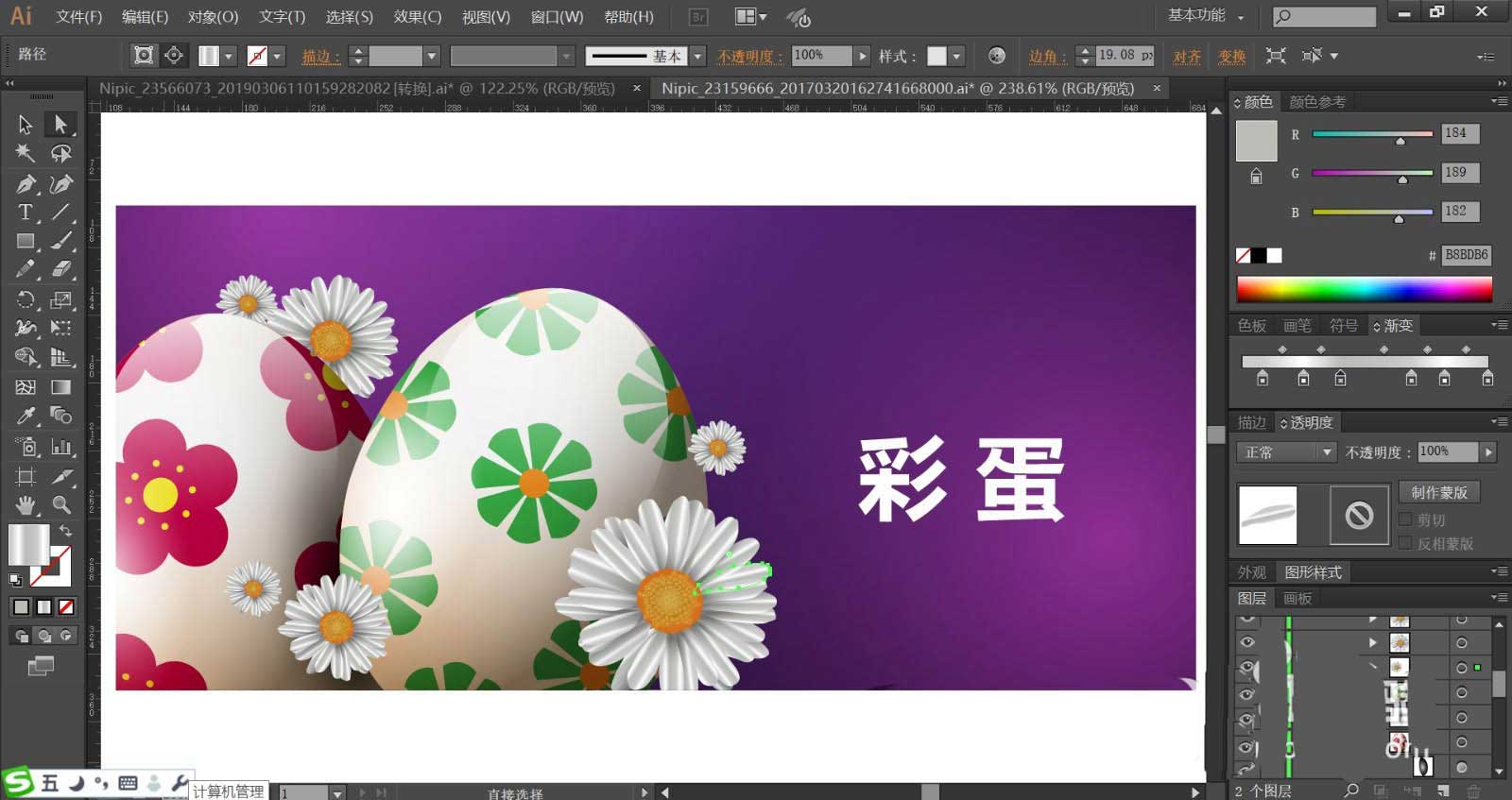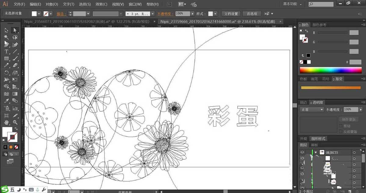 3、使用文字工具画出右侧的文字,再用白色填充,使用灰白色的渐变填充彩蛋的路径,再用酒红色与黄色填充花朵与花蕊的路径。
