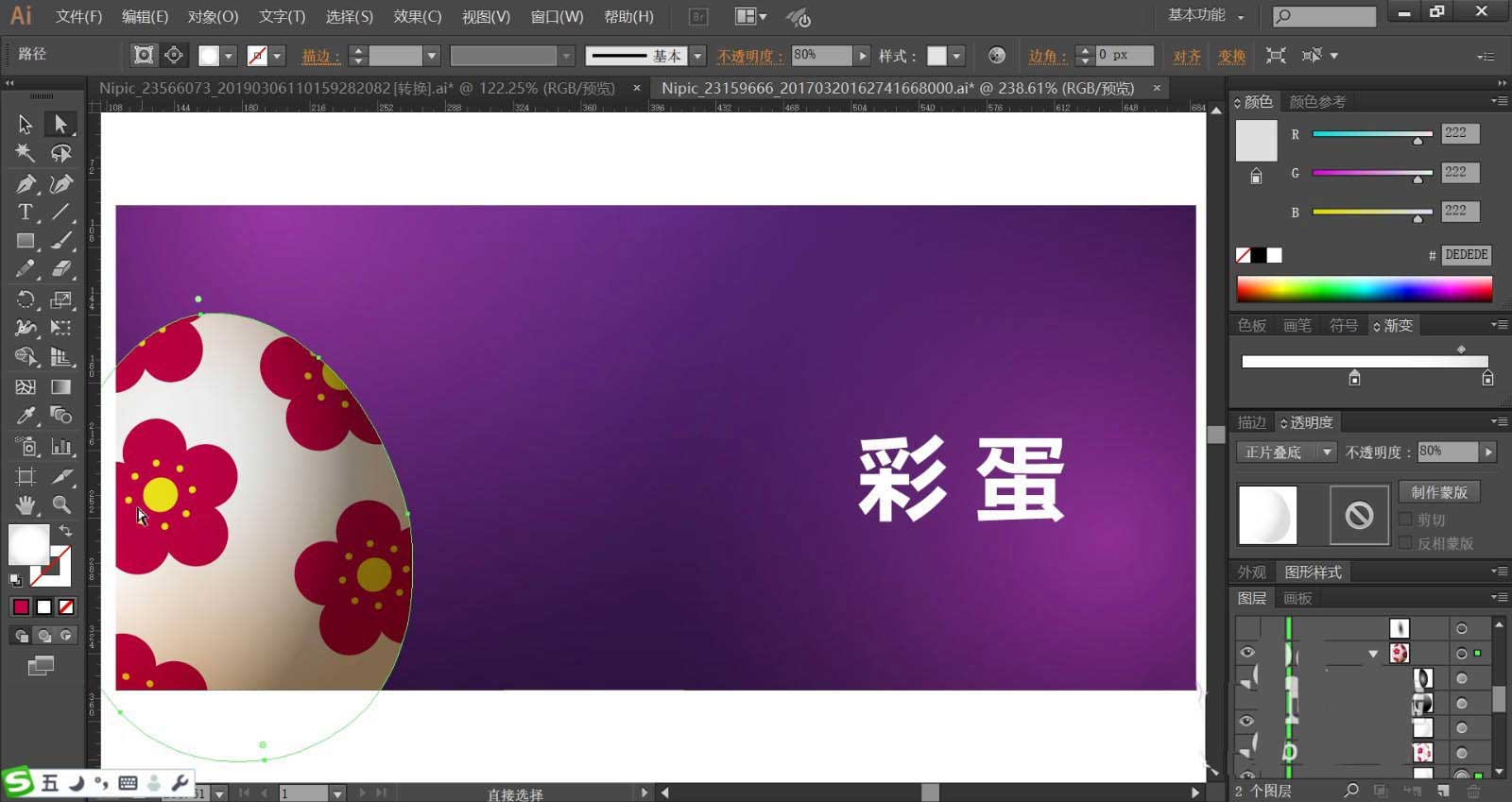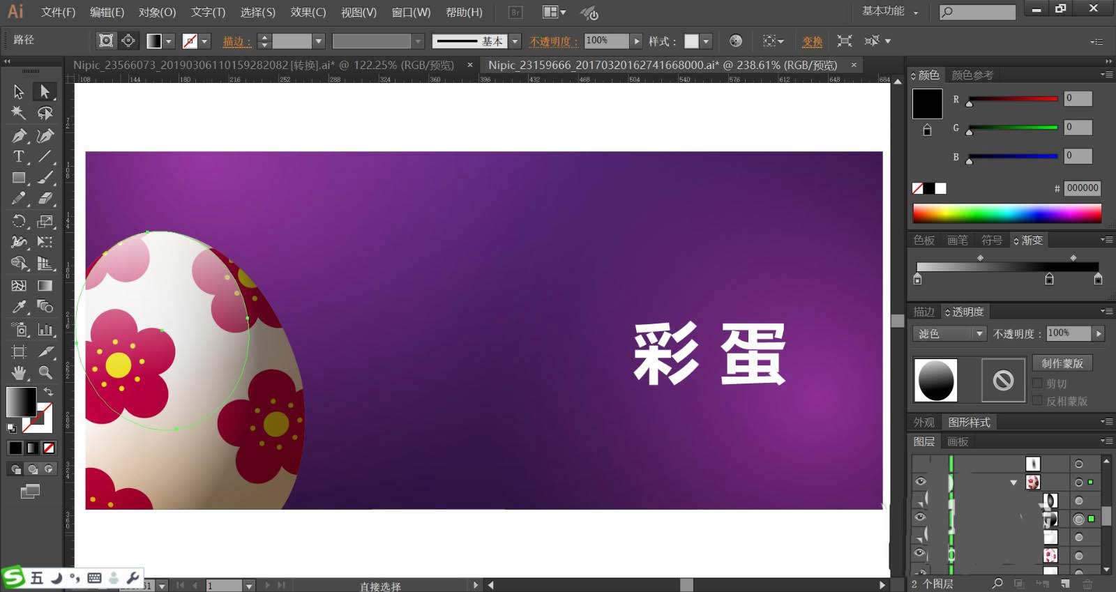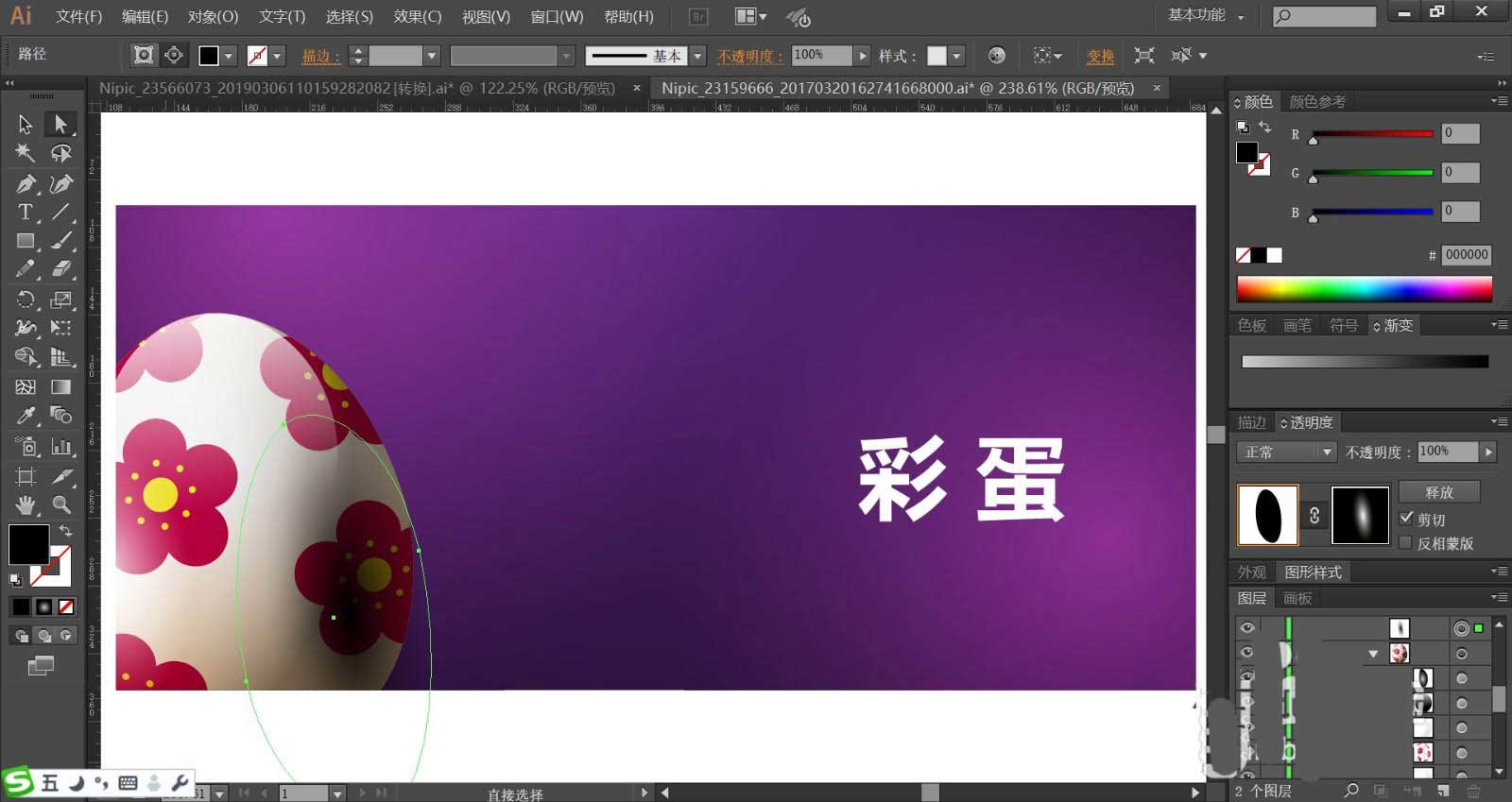 1、使用矩形画出背景,再用圆形画出彩蛋的路径,使用钢笔画出彩蛋上面的花朵图案,使用文字工具打出文字在背景的右侧位置。