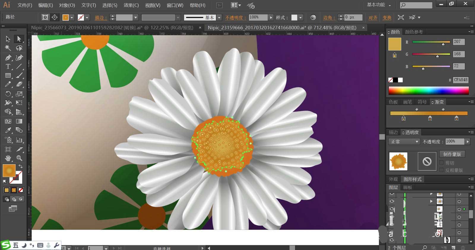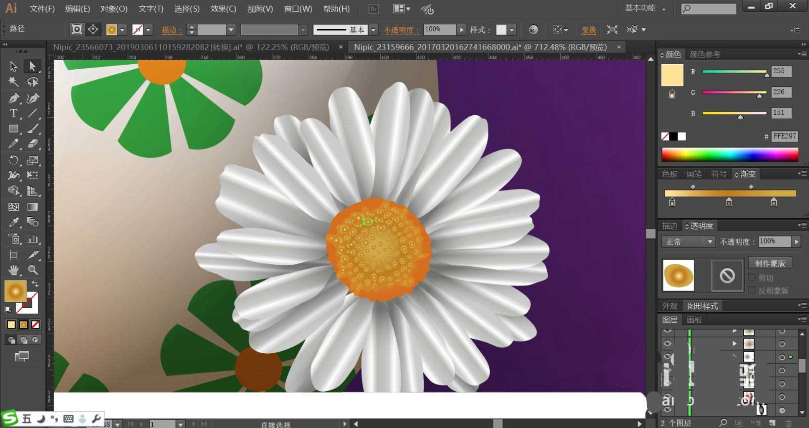 6、使用多个明度不同的灰白色设置成一个灰白色的渐变填充花朵的花瓣,再用橙黄色填充花蕊,使用正片叠底模式的黑色渐变填充花瓣的暗光路径。