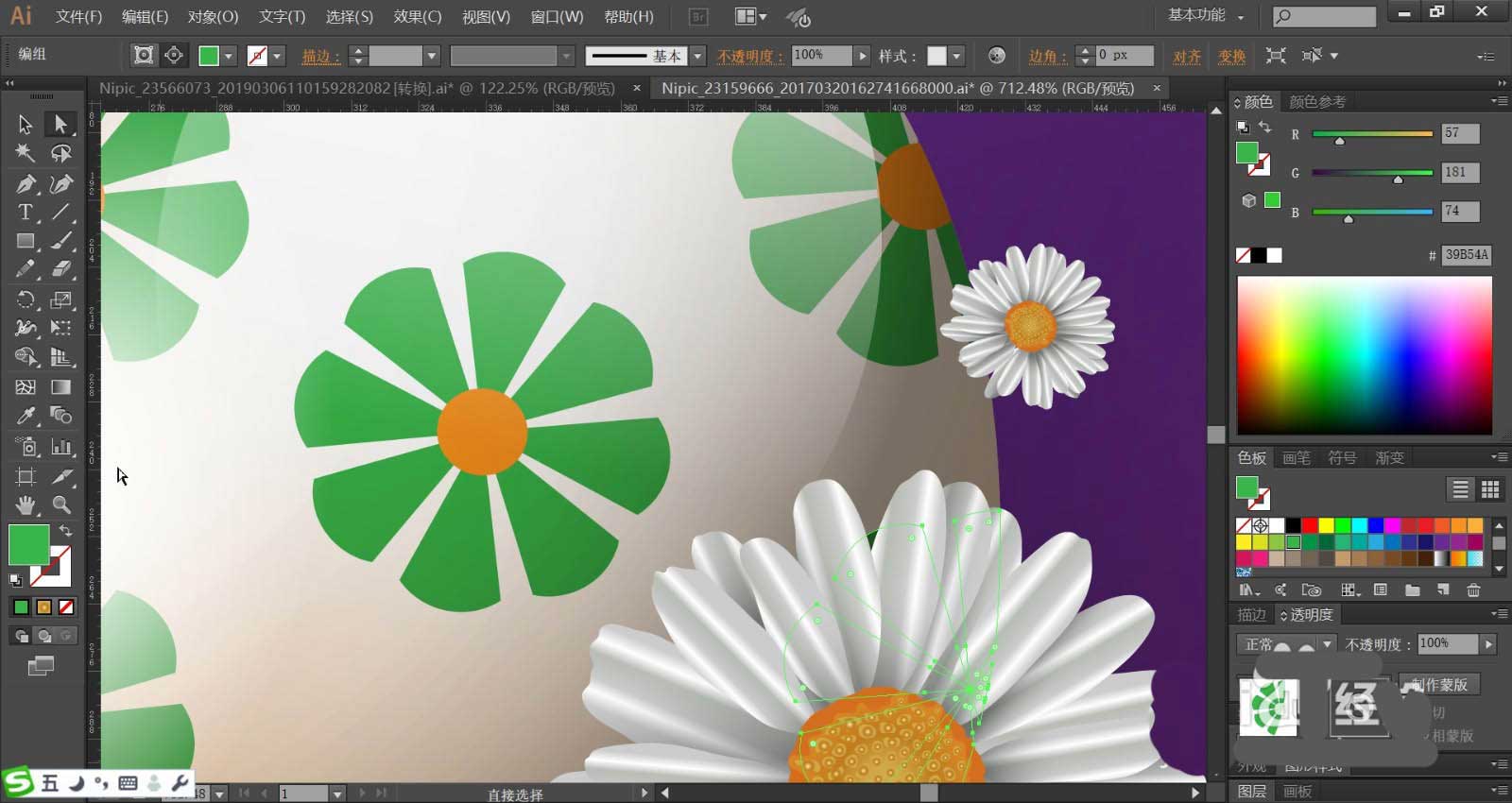 5、使用同样的方法绘制出右侧的另外一个绿花朵的彩蛋,也同样做出表面的明暗效果。