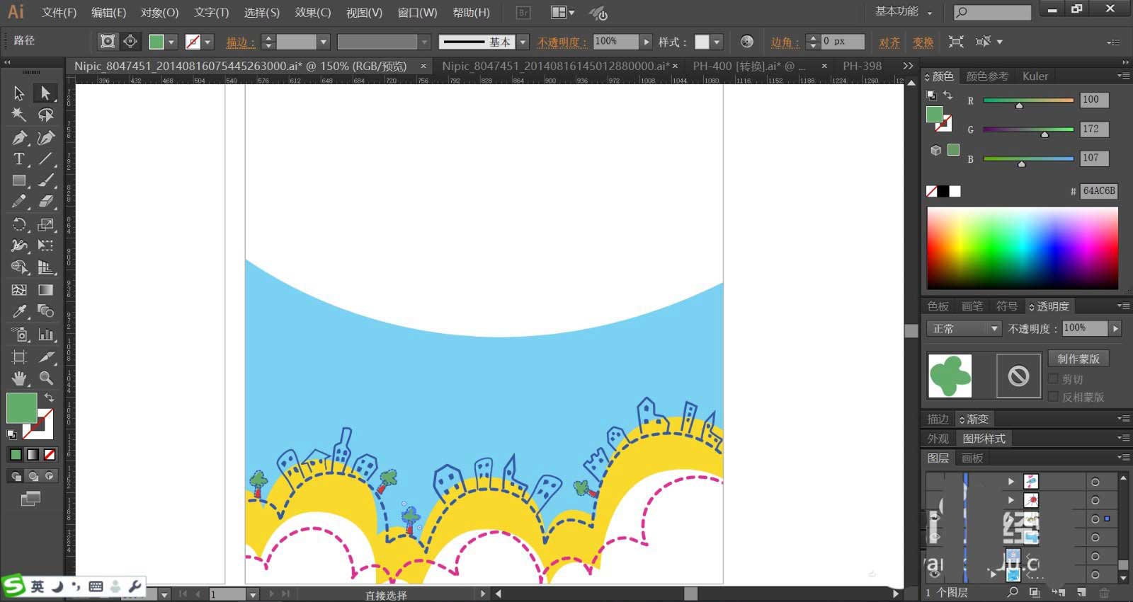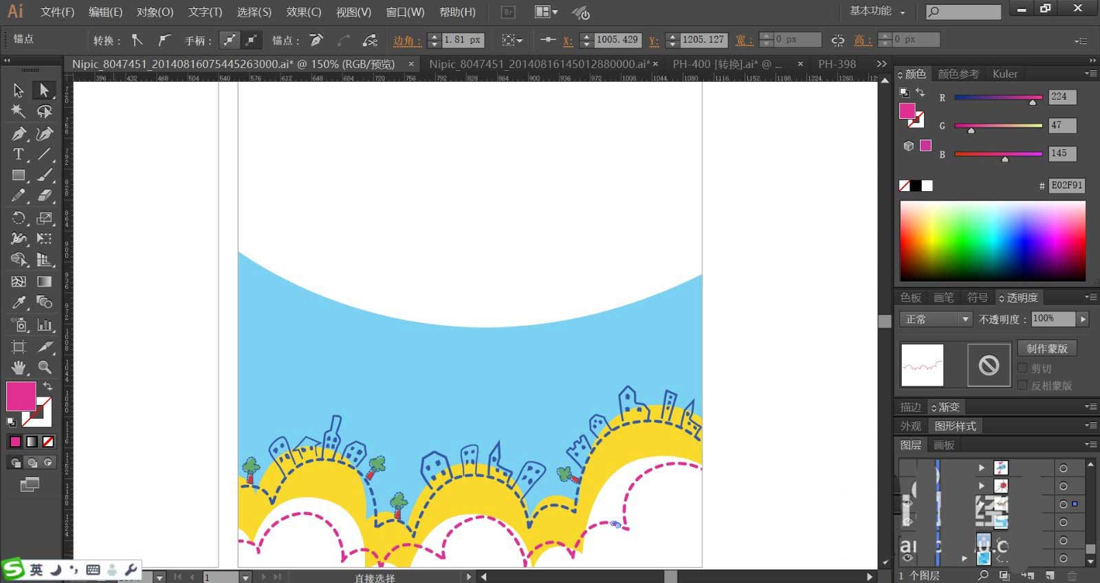3、使用绿色与品红色搭配填充小树苗的路径,再用深蓝我对于楼房的虚线进行描边。
