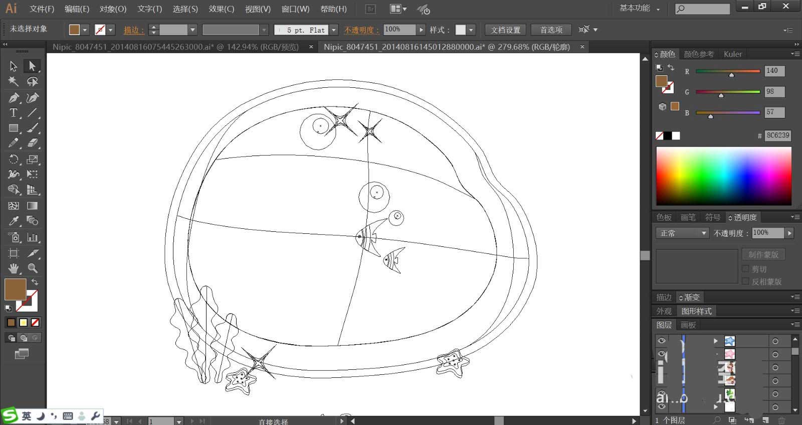1、使用钢笔圆形的水池内外轮廓细节,再画出左侧的水草与右侧的海星结构路径。