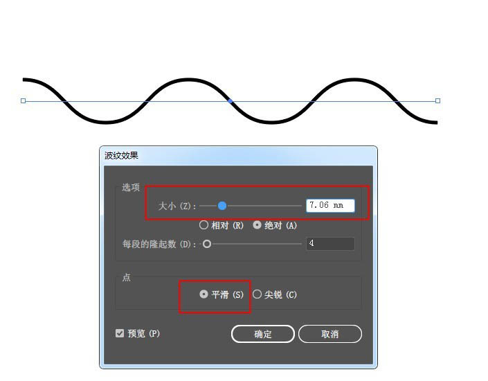 2、点击效果-扭曲和变换-波纹效果,勾选平滑,调整参数,将直线变曲线,再点击对象-扩展。
