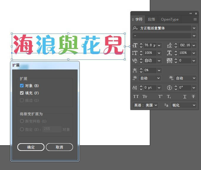 3、打上需要制作的文字,调整好字体,并转曲然后扩展对象取消编组。