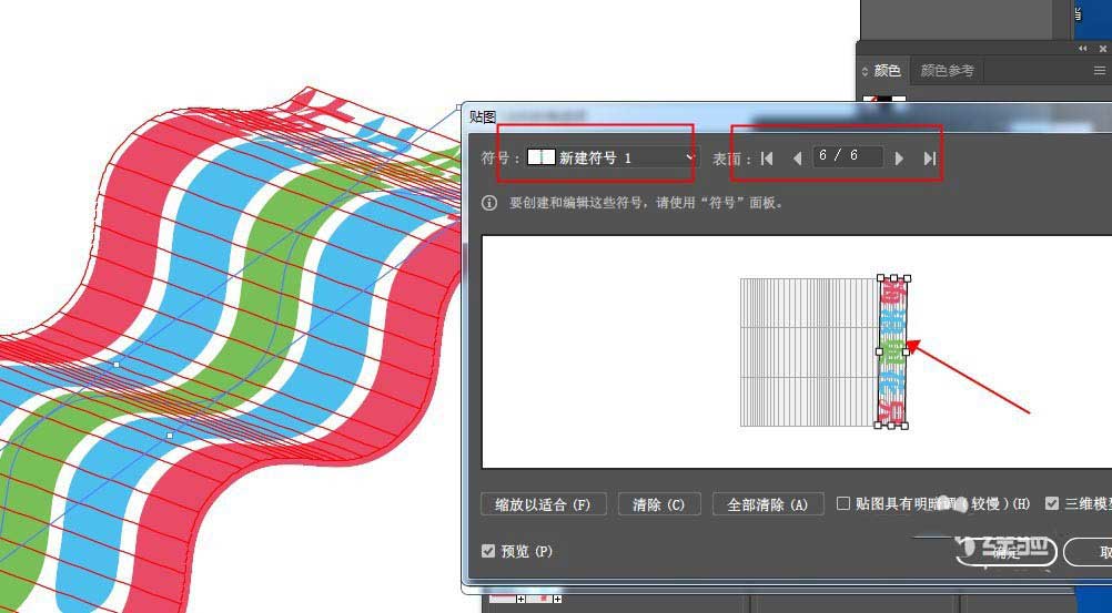 7、打开贴图面板,选择合适的面,将刚才新建的符号贴入,调整大小和方向。然后扩展对象,用直接选择工具调整文字端的锚点,让文字更清楚。