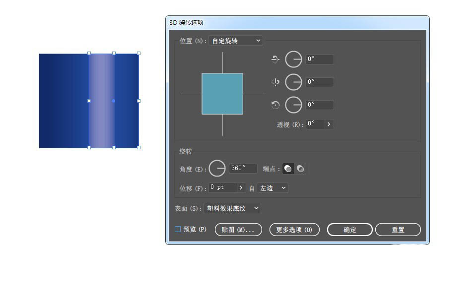 4、再画个矩形,打开3D绕转面板,将角度参数全部设置为0。点击贴图,表面选择3/3,符号选择刚才新建的。点击缩放以适合,勾选三维模型不可见。