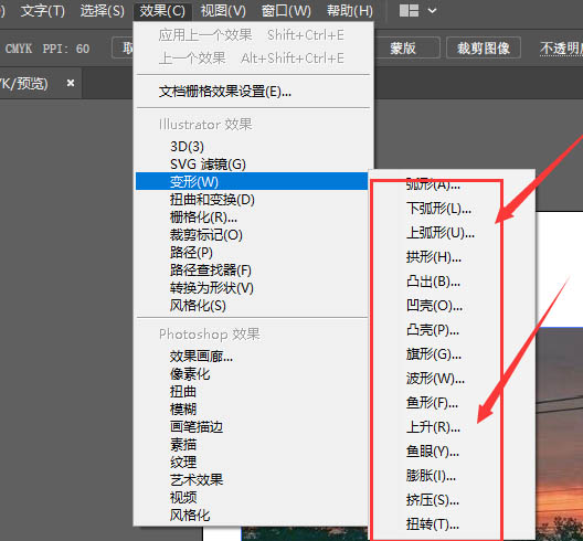 在右侧变形栏中,有多种变形样式,选择需要的样式点击即可