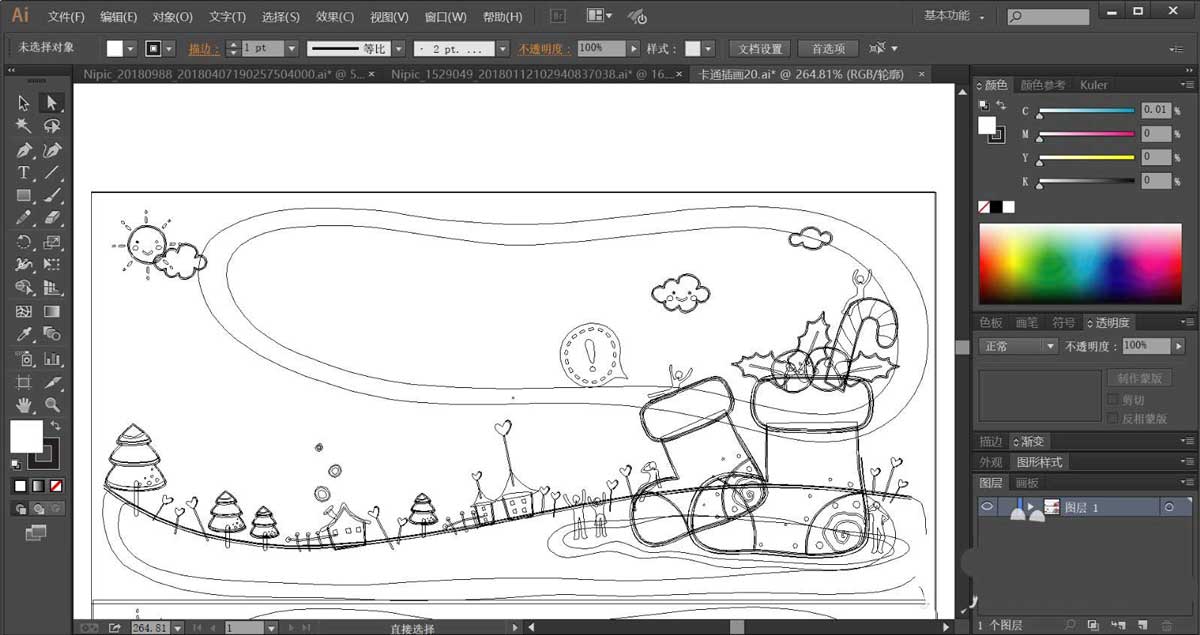 1、使用钢笔工具画出背景所在的天空和地面,还有地面的各种各样的房屋、小树、人物,再画出大大的圣诞袜子,以及袜子里面的各种礼物。