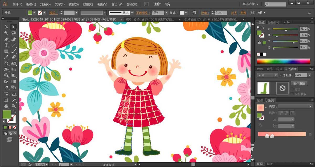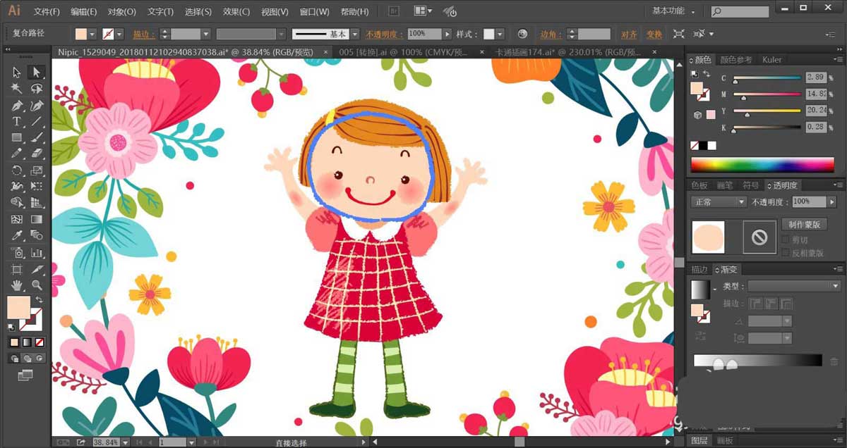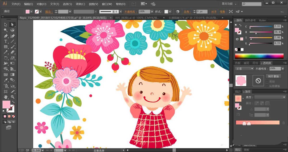 7、枝条使用绿色与暗绿色搭配填充,复制花朵到小女孩上方和下方的不同位置,让其组成一个圆圈结构,完成花小孩插画设计。