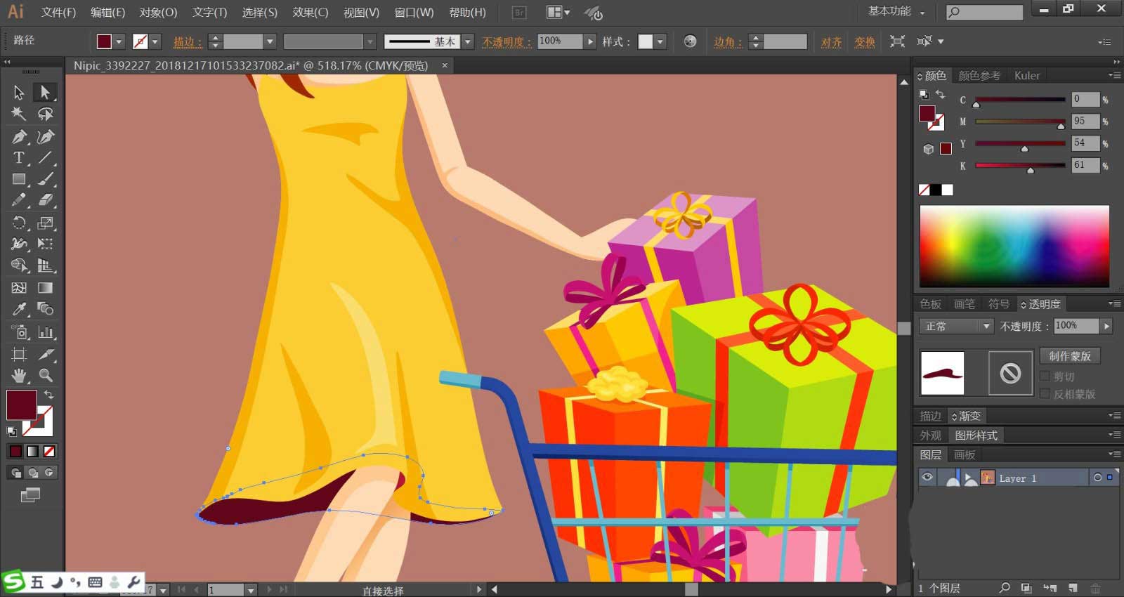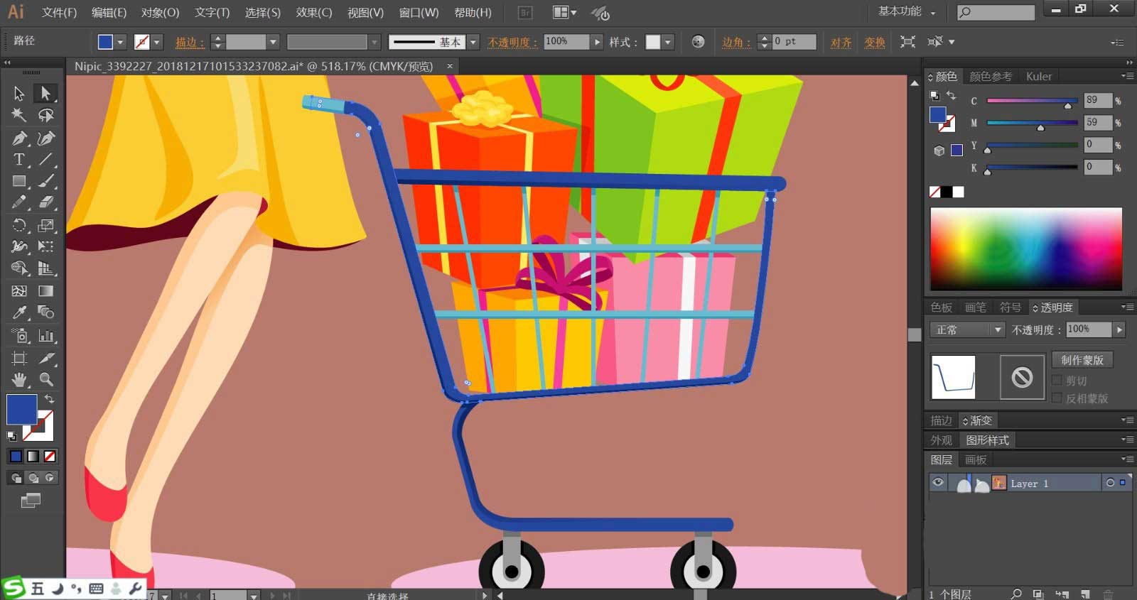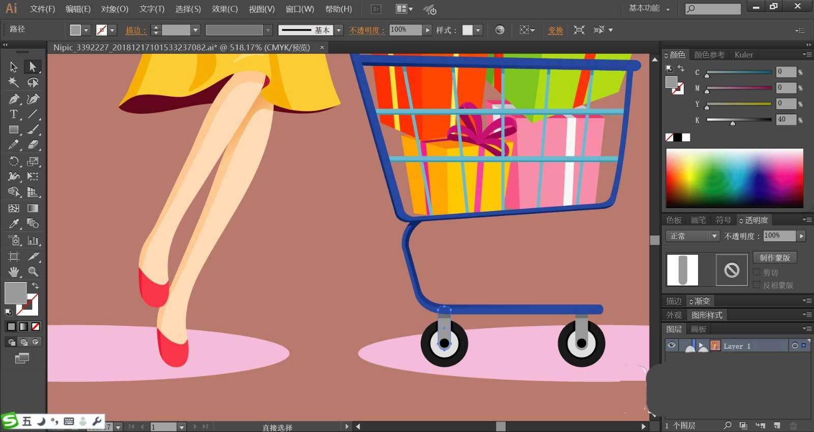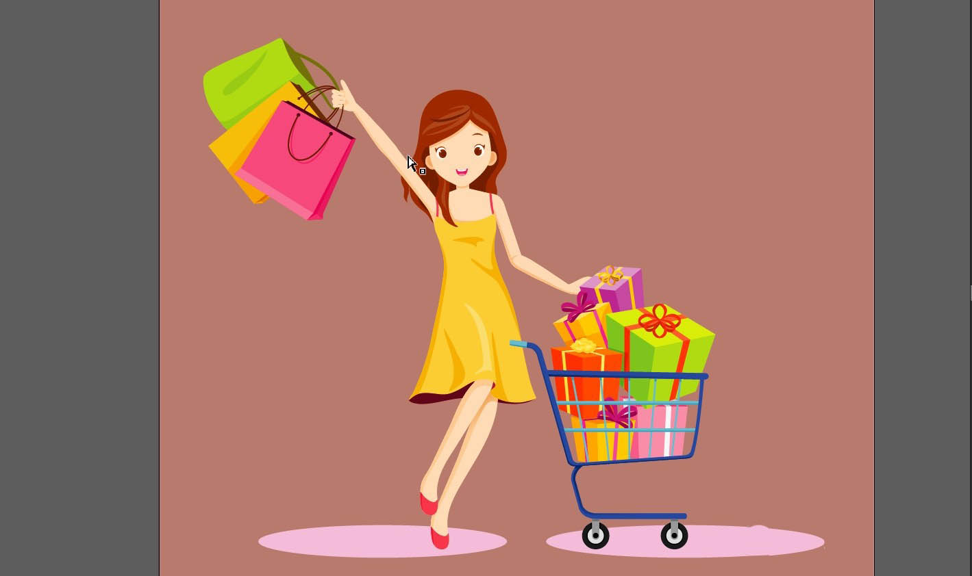 8、最后我们用粉色填充女孩的腿部皮肤,在做出明暗效果,她的鞋子使用粉红色与红色搭配填充,女孩与购物车在下方的阴影使用粉红色填充,整个背景使用红褐色填充,完成开心购物插画设计。