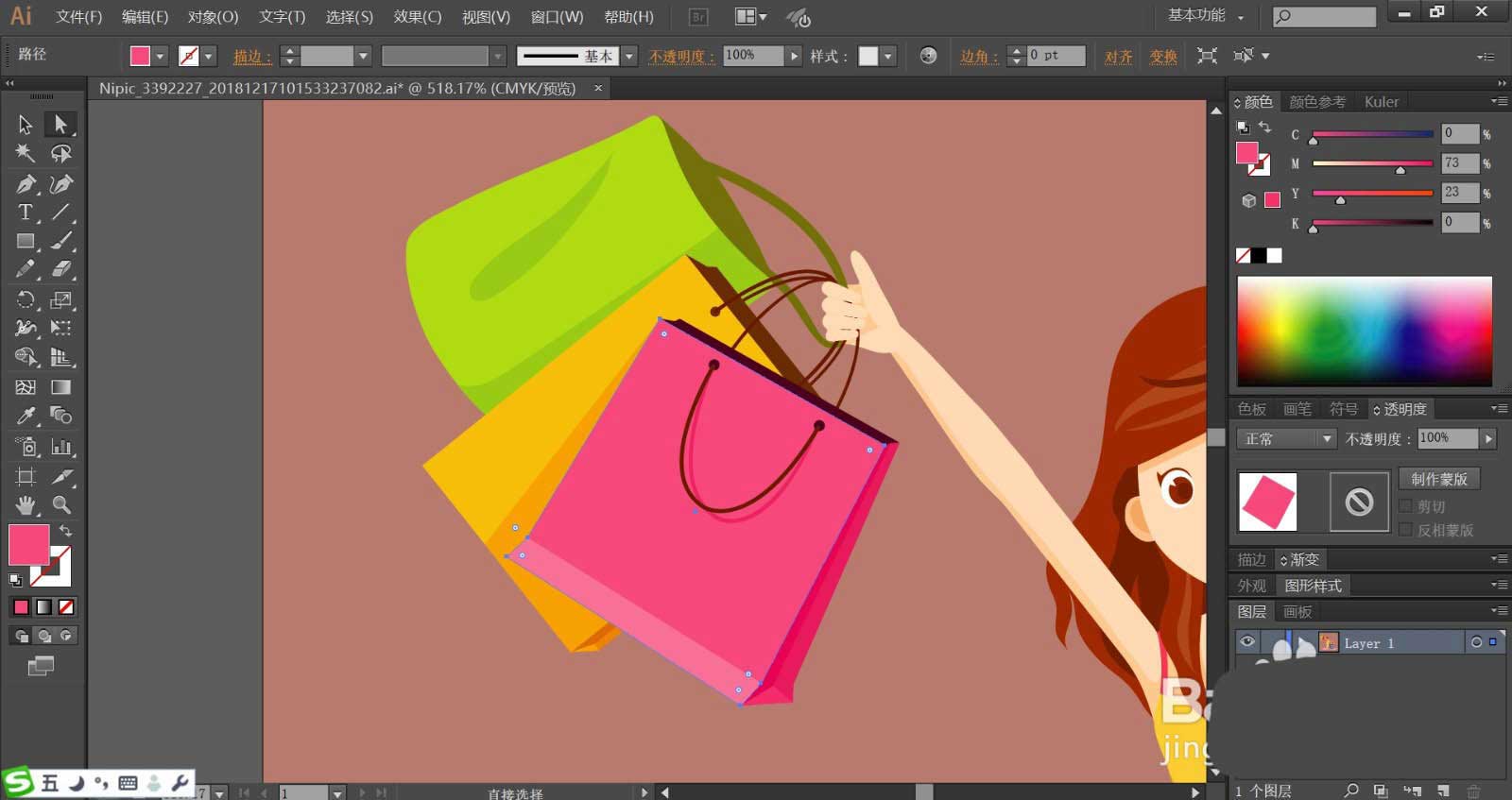 3、购物袋上方的绳索使用红棕色进行填充,绳索在购物袋上的阴影使用对应购物袋袋相似色行填充女孩的手臂,使用粉色进行填充,在边缘的暗光使用暗粉色进行填充。