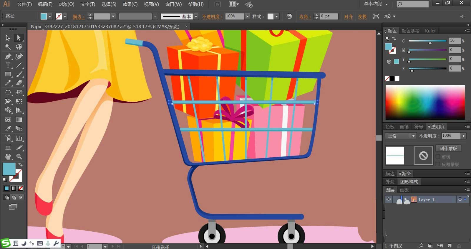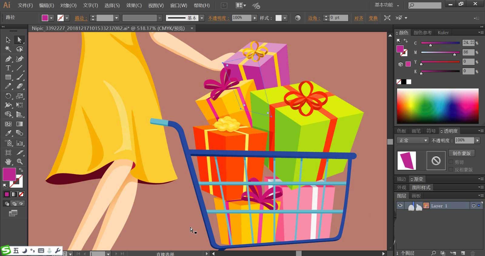 6、购物车内的礼盒分别使用紫色,绿色,黄色,橙色,红色,粉色等色彩进行填充,不同的侧面稍稍调整一下亮度,让侧面的不同效果呈现出来,李河上的包装袋分别使用红黄粉白,这四种颜色进行搭配使用套色,让礼盒的立体真实感更加强。