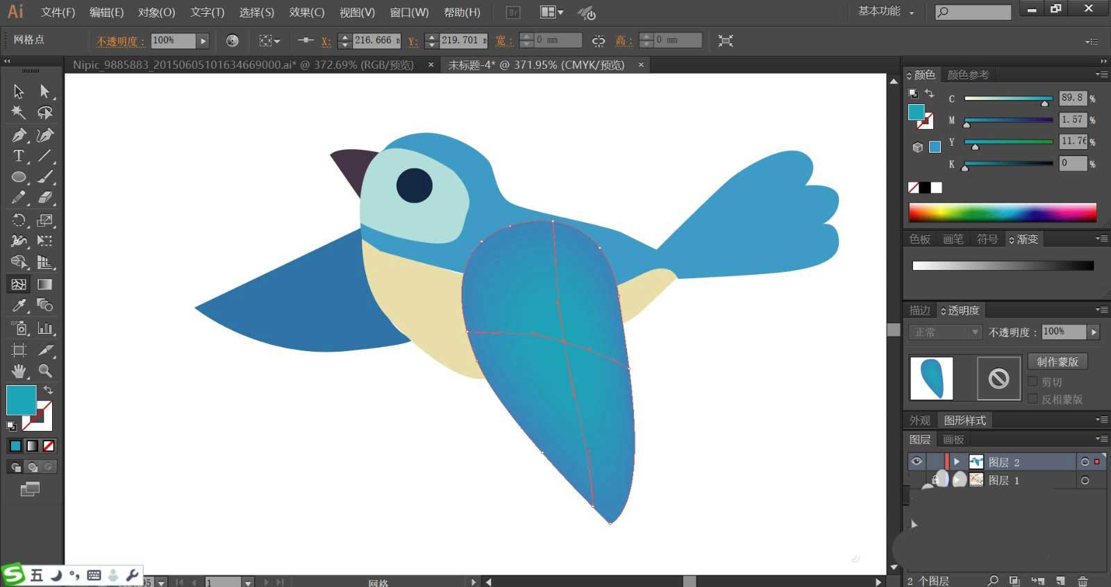 2、使用蓝色填充飞鸟的翅膀与身体,于用网格工具让其呈现纯蓝色的渐变效果,使用米白色填充飞鸟的肚子下方的毛发路径。