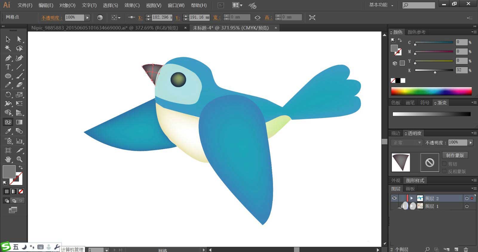 4、使用天蓝色填充飞鸟的脸部,再用黑色填充飞鸟的眼睛与嘴巴,用网格工具点击一下飞鸟的脸部让其呈现天蓝色渐变的效果,再用网格工具让眼睛呈现绿黑色渐变的效果。