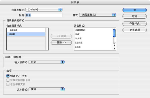 4)逐次点按“添加”命令,将这些设置好的段落样式名称从“其它样式”对话框中添加到“包含段落样式”对话框中去。在样式栏中选择目录正文的样式。点“好”。