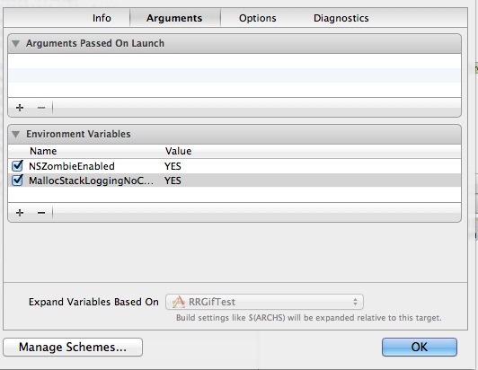 (通过Product->Scheme->Edit Scheme进入下面编辑页面,选中Arguments tab,增加标计位NSZombieEnabled设为YES)