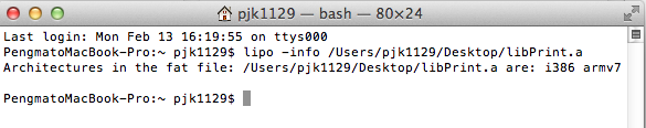 然后打入如下命令:lipo -info /Users/pjk1129/Desktop/libPrint.a