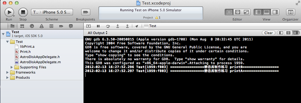 我们添加很简单的"- (void)printA;"和"+ (void)printB;"的方法,这个方法的实现也是很简单的,在*.m文件中的实现就是一个"NSLog(@“”);"这样我们编译出来的libstaticlib就可以被其他的IOS工程进行调用了。这块注意一下,目前我们的Print->iOS Device