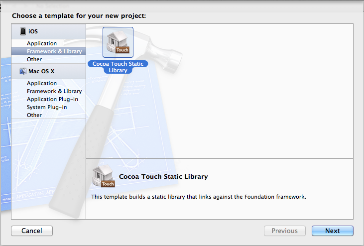 Xcode New一个新的project,选择IOS下面的Framework&Library,下面有一个Cocoa Touch Static Library。直接next去建立一个Print这样的工程。
