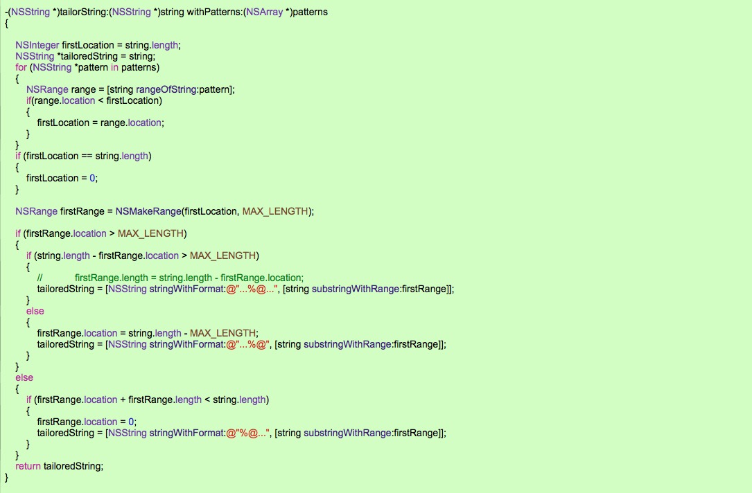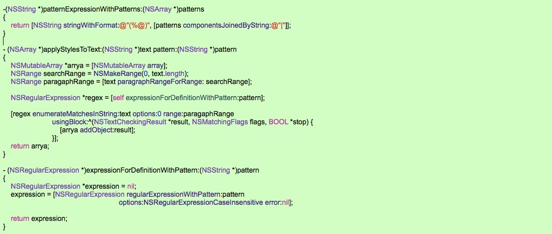 传入字符串text,和需要高亮的字串patterns , 正则表达式就是字串的 "|" 集合, 根据正则表达式进行字串的大小写不敏感匹配, 然后枚举生成的NSTextCheckingResult,保存在数组中,接下来就可以对label字体进行设置了