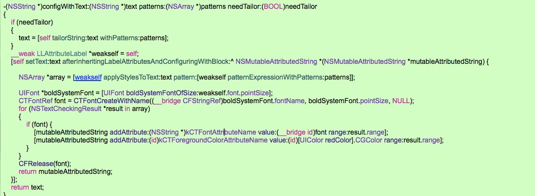 这里用的是TTTAttribute的setText:afterInheritingLabelAttributesAndConfiguringWithBlock:方法, 在代码块里面遍历所有的NSTextCheckingResult对象,对其中的NSRange进行颜色字体的设置就完成了想要的效果