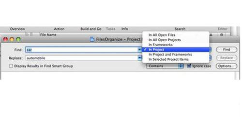 在Find栏输入要查找的字符;在Replace栏中输入要替换查找到的字符的字符;我们选择在工程中查找。如果我们不选择Ignore case 则替换只发生在main()函数中。