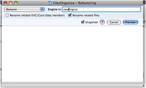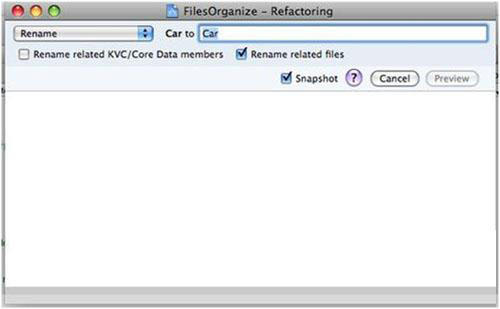 按下 preview按钮,界面如下所见,Xcode自动给处了我们分析报告,有什么文件将被修改,每个文件有几处会被修改等信息。从下面图可以看到,类名以及类的文件名都被修改了。