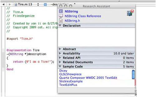 如下图所示:在Tire.m文件中,当光标在NSString类上时,研究助手浮动窗口所显示的信息: